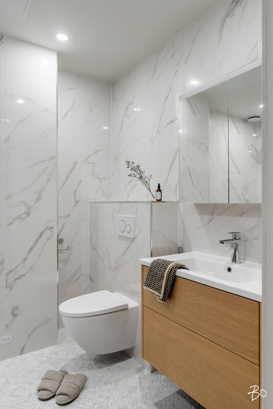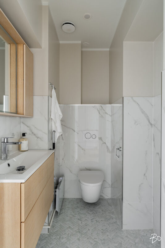 Seinä-WC, kaapistot (INR), Oras-hana, sadesuihku, bidee, pyyhekuivain sekä tilaa pesutornille.