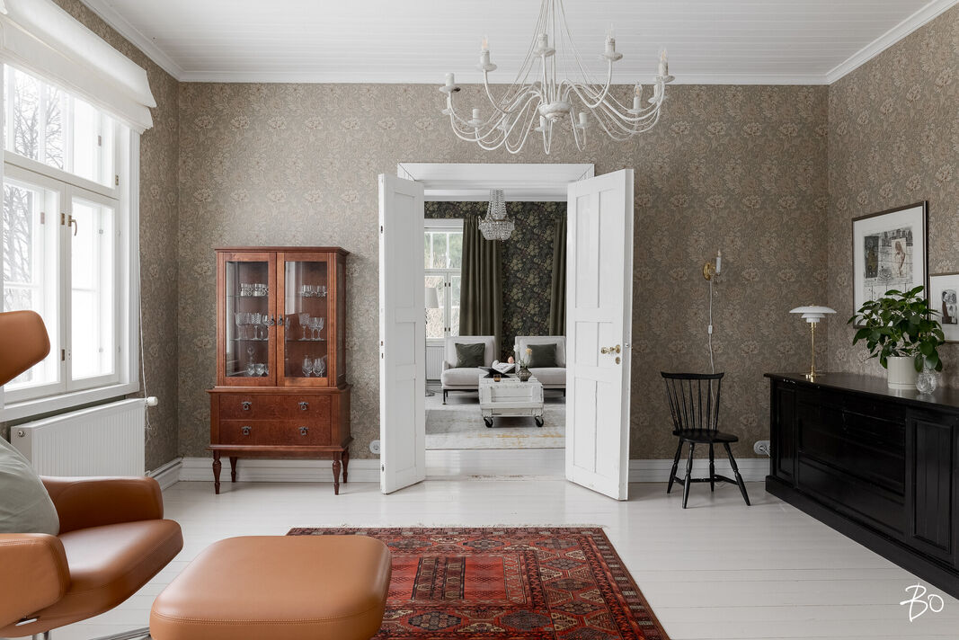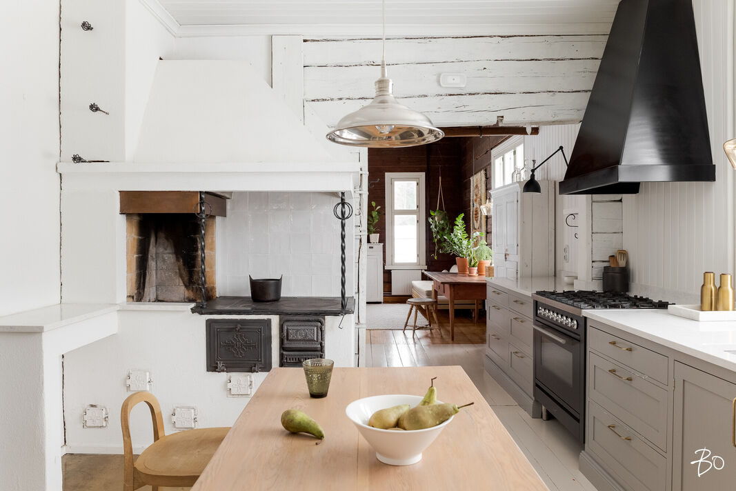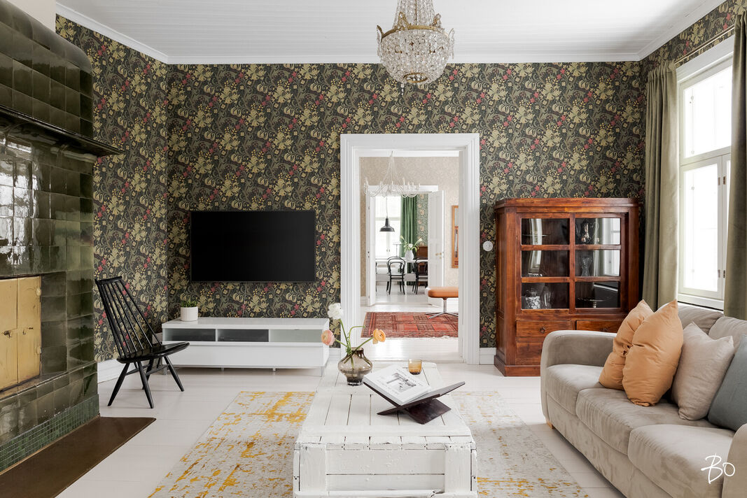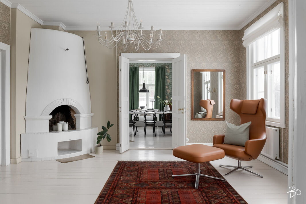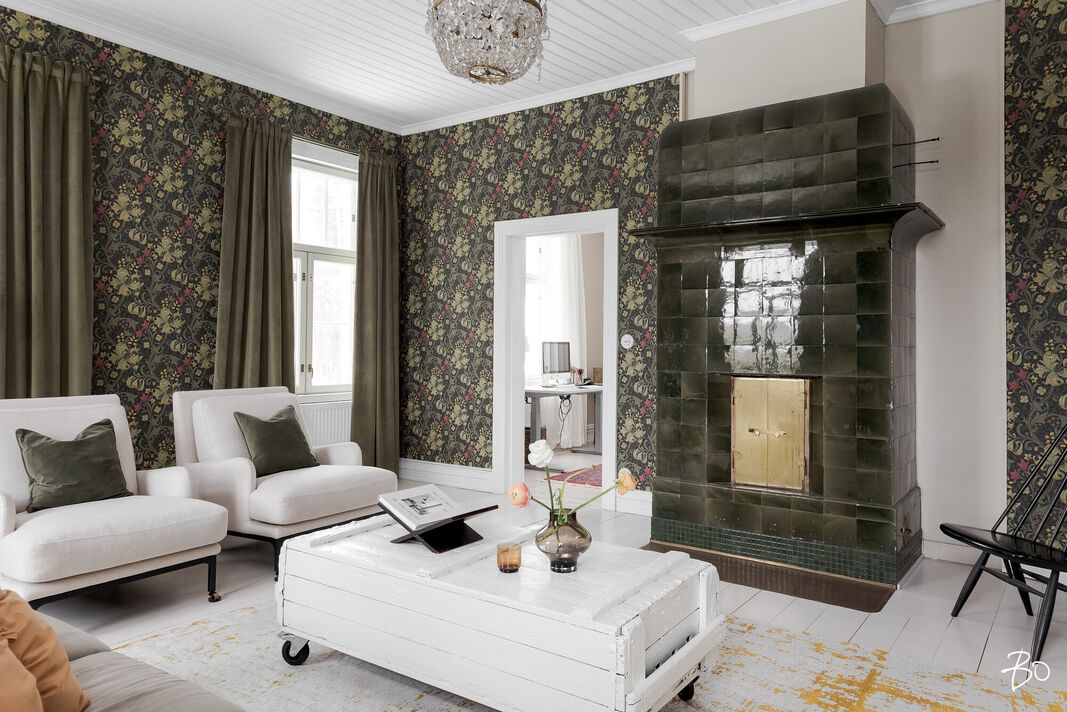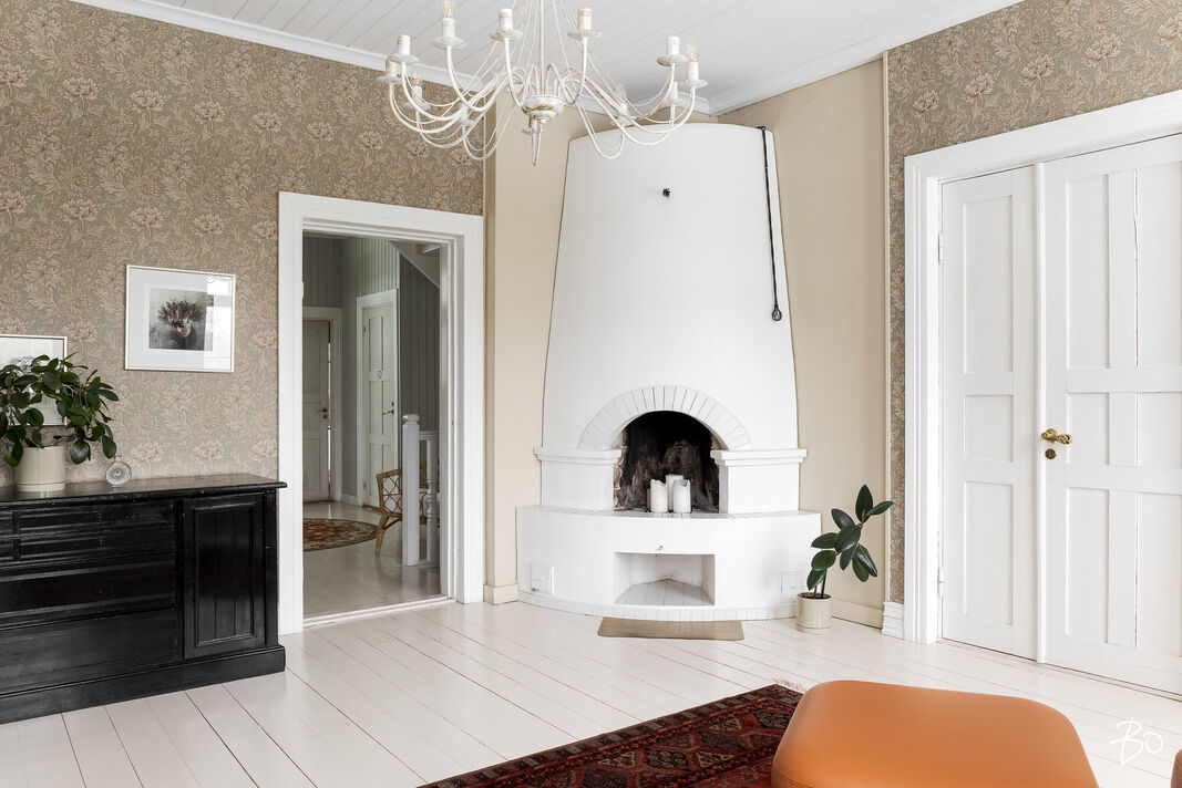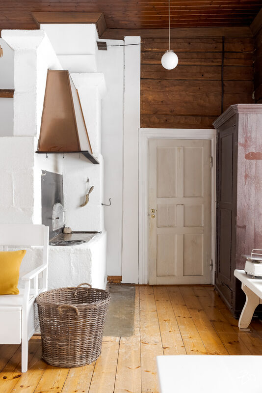 Sisätilat henkivät vanhan ajan charmia ja tinkimätöntä laatua, mm. seinillä on upeat tarkkaan valitut William Morrisonin tapetit, upea täysin modernisoitu keittiö kvartsitasoineen ja kaasuliesineen. Talo sisältää avaran tuvan, keittiön, ruokasalin, keskisalin, olohuoneen ja kolme makuuhuonetta. Asunnon sydämen, keittiön, varustelutaso on kattava ja ajaton. Eteisaula on tilava ja tästä voi jo aistia talon hengen.