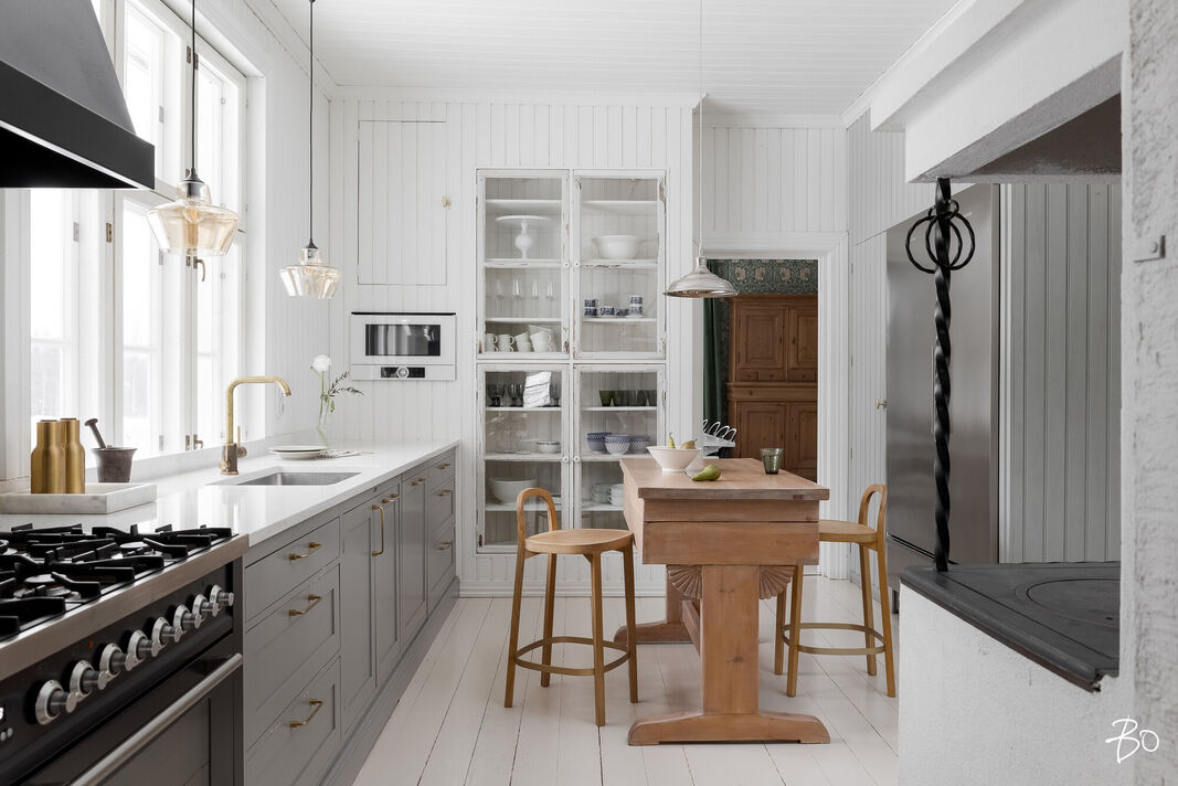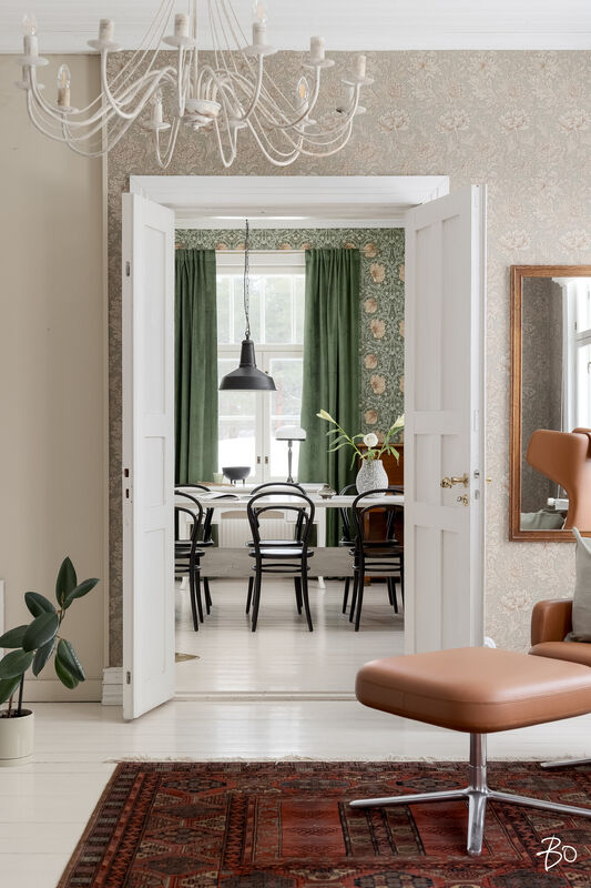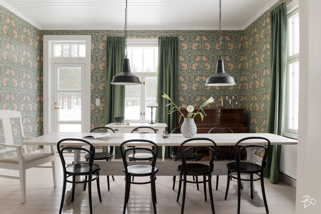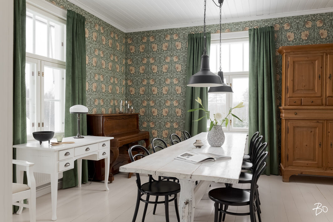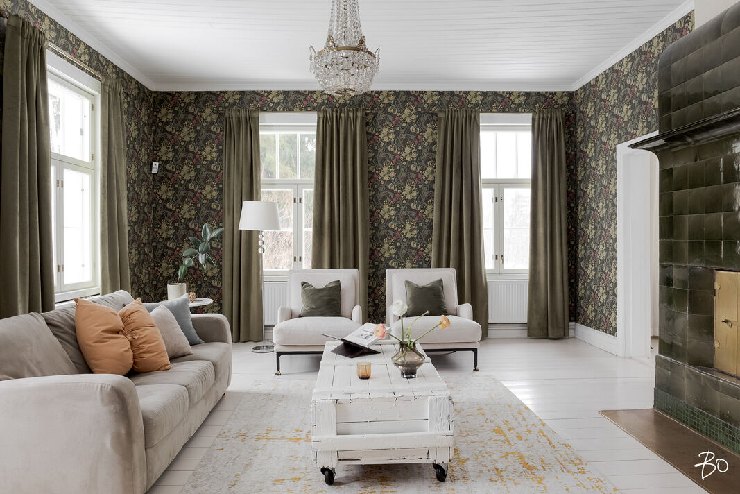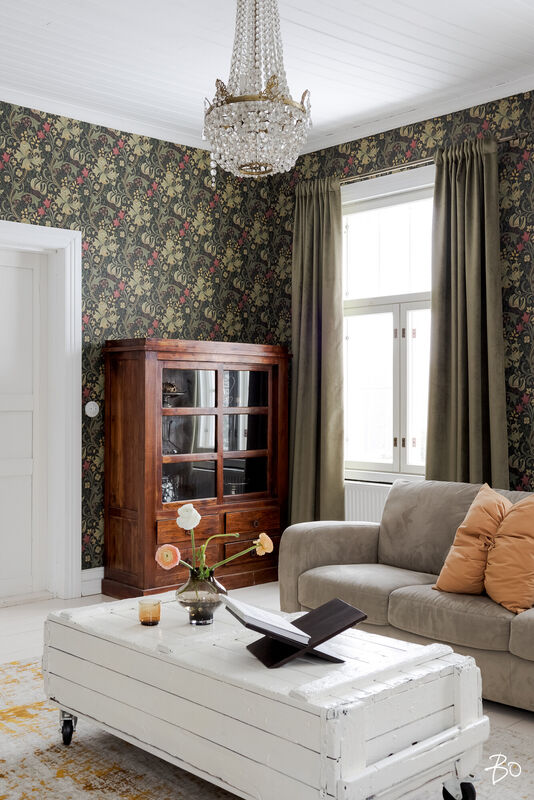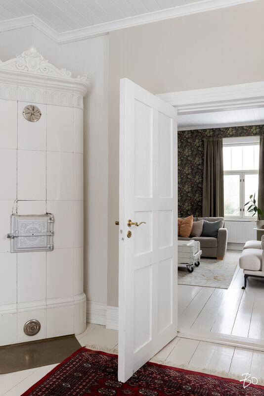 Sisätilat henkivät vanhan ajan charmia ja tinkimätöntä laatua, mm. seinillä on upeat tarkkaan valitut William Morrisonin tapetit, upea täysin modernisoitu keittiö kvartsitasoineen ja kaasuliesineen. Talo sisältää avaran tuvan, keittiön, ruokasalin, keskisalin, olohuoneen ja kolme makuuhuonetta. Asunnon sydämen, keittiön, varustelutaso on kattava ja ajaton. Eteisaula on tilava ja tästä voi jo aistia talon hengen.