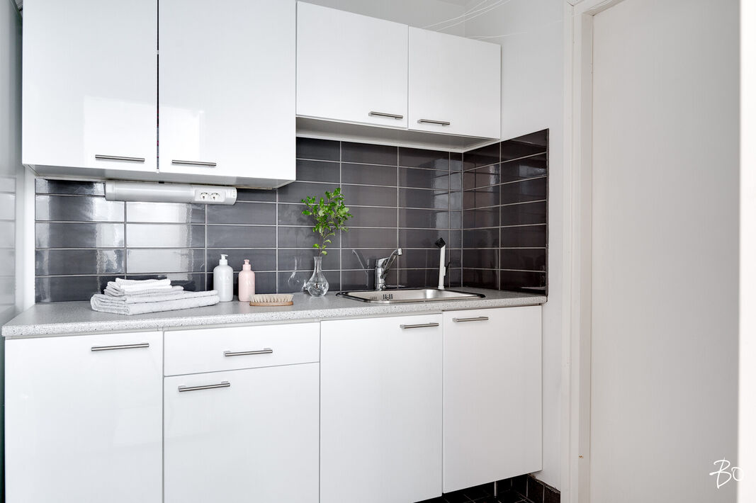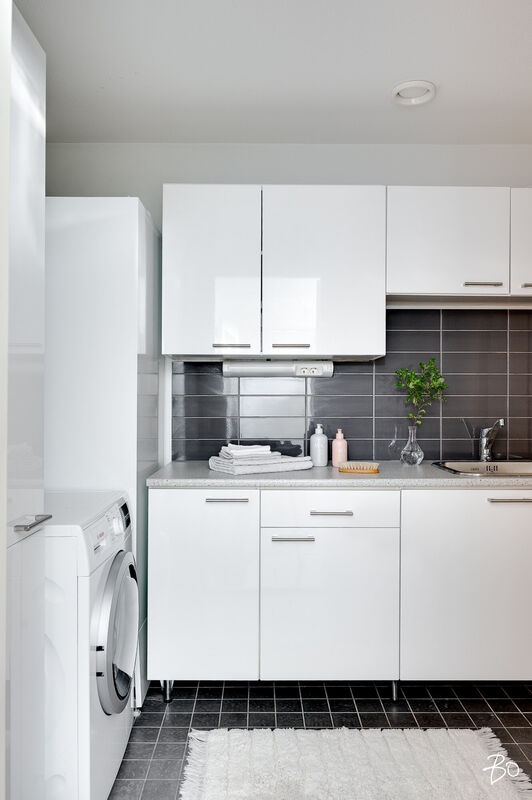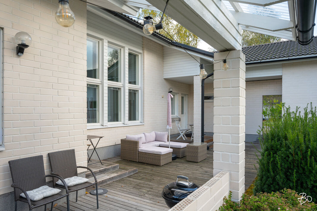 Olohuoneesta on suora kulku ulkoterassille, joka jatkaa kodin oleskelutiloja luontevasti ulos. Erillinen kodinhoitohuone tekee arjesta helppoa ja toimivaa, ja sieltä on käynti myös ulos.