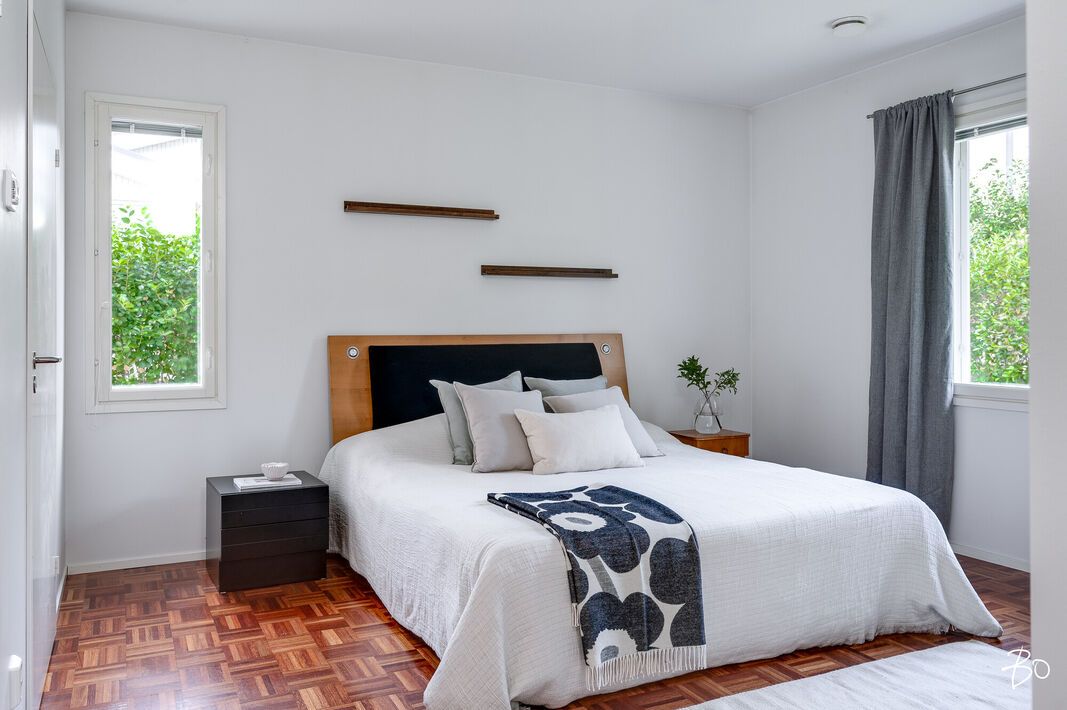 Kodin selkeä ja harkittu pohjaratkaisu tekee asumisesta sujuvaa ja mukavaa. Kolme makuuhuonetta tarjoavat hyvin tilaa perheelle. Suurimman makuuhuoneen yhteydessä on oma kylpyhuone suihkulla, erillinen wc sekä tilava vaatehuone arjen luksusta ja yksityisyyttä parhaimmillaan.