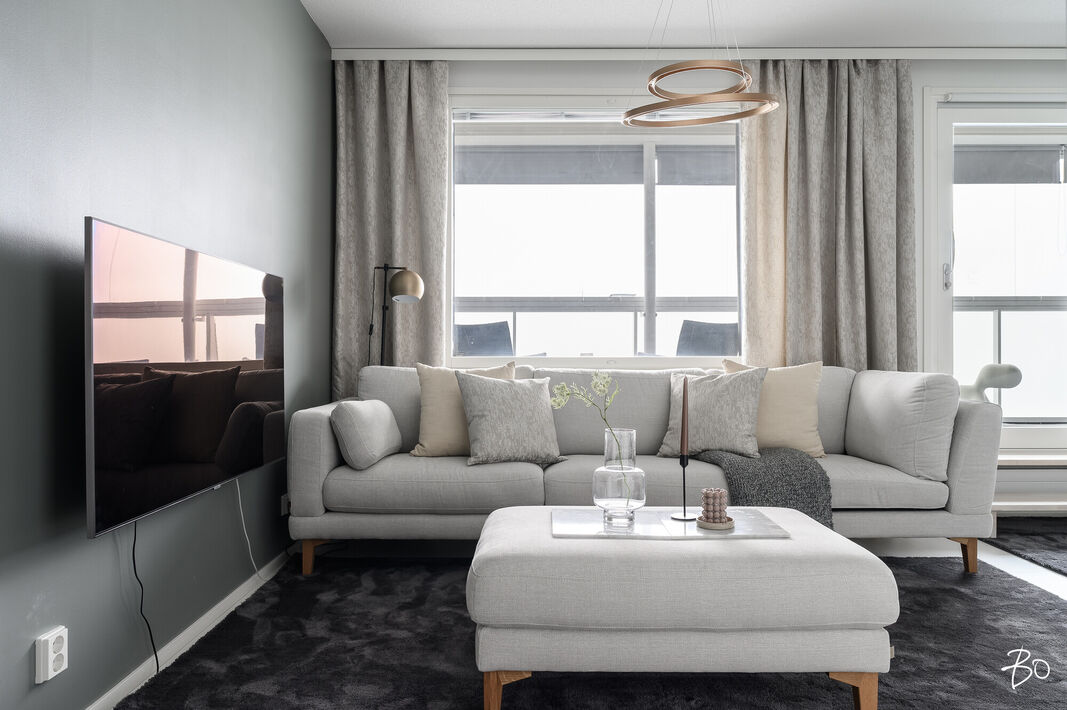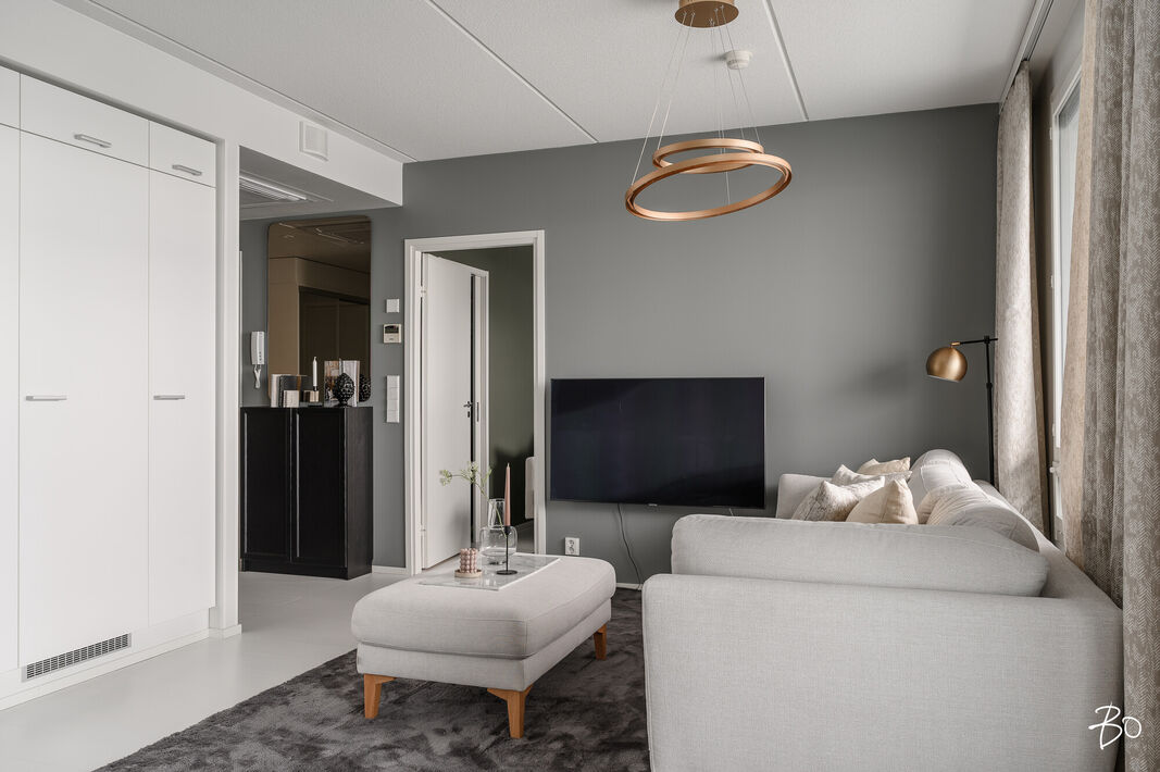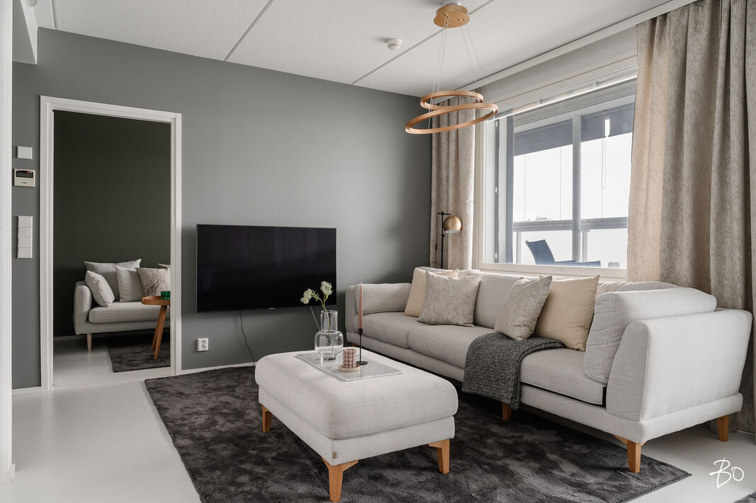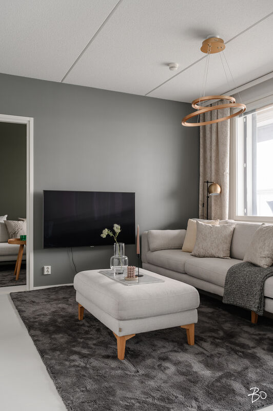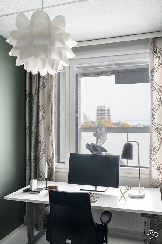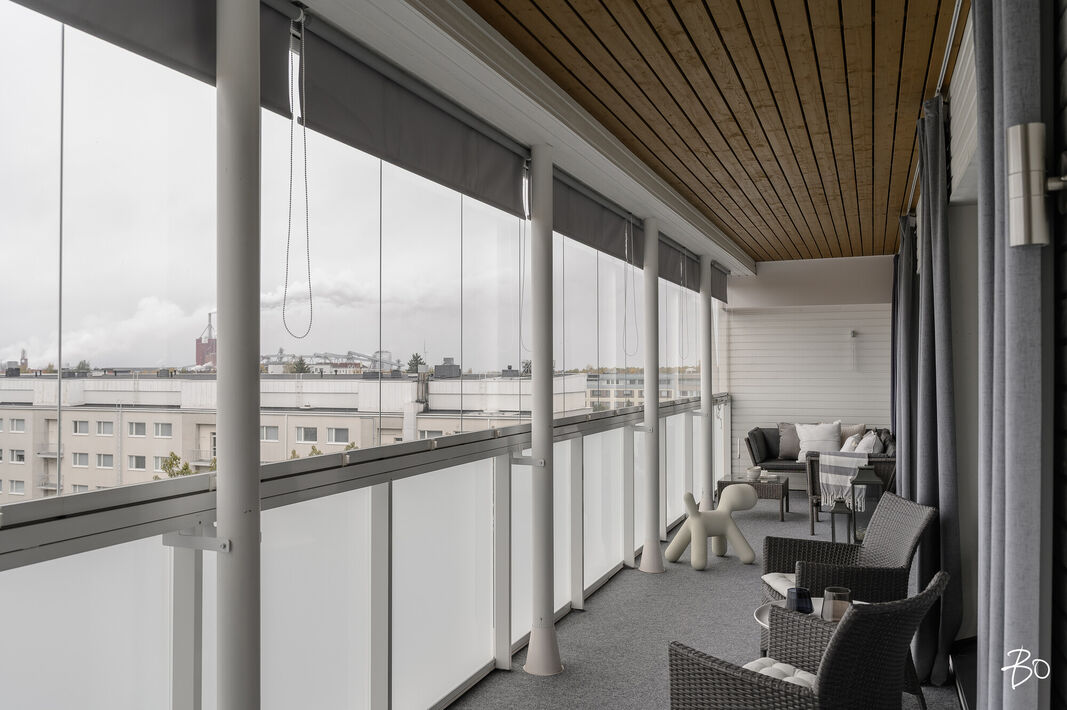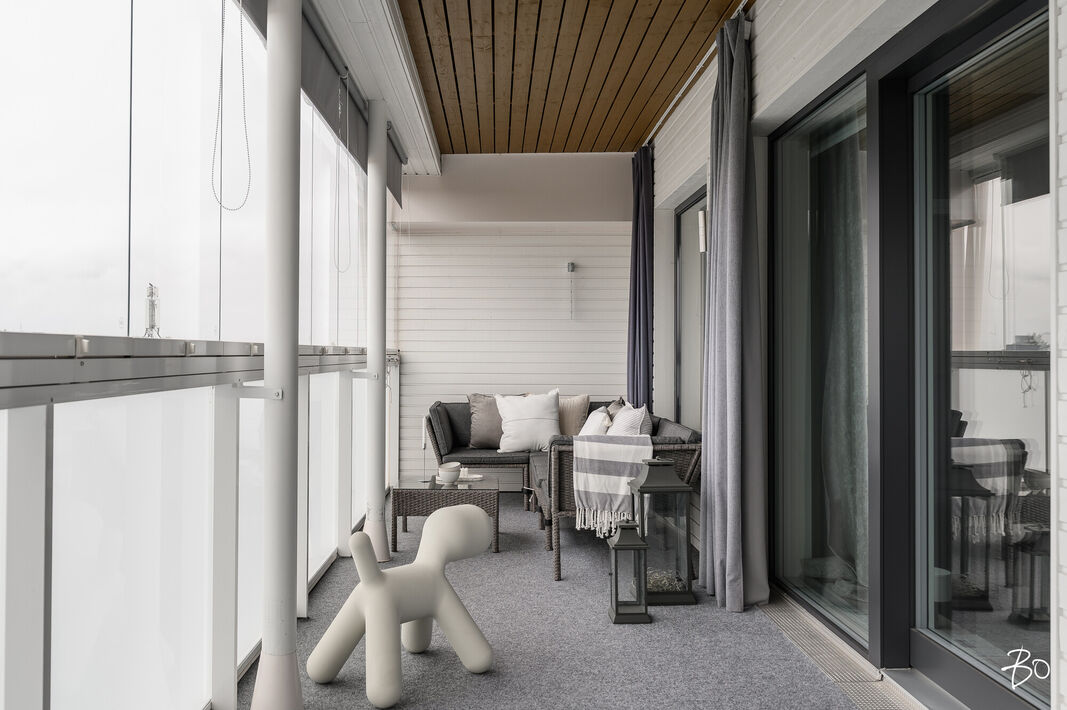 Tämä 67 neliöinen koti on uudehko ja pitää sisällään kaksi makuuhuonetta, yhtenäisen keittiön ja olohuoneen yhdistelmän sekä erinomaisesti varustetun kylpyhuoneen, josta löytyy myös tunnelmallinen sauna. Parasta tässä kodissa on ehdottomasti reilun kokoinen lasitettu parveke, jossa on huikeat näkymät! Kodin suuret ikkunat avautuvat etelään, joten luonnonvaloa kodissa riittää. Huoneiston vaalea värimaailma antavat vapaat kädet sisustamiseen. Kodissa on reilusti säilytystilaa; eteiseen yhdistyvät keittiön kaapistot ja makuuhuoneessa on kaapistot vaatteiden säilytykseen ja toisesta löytyy vaatehuone. Kodissa on myös erillinen wc.