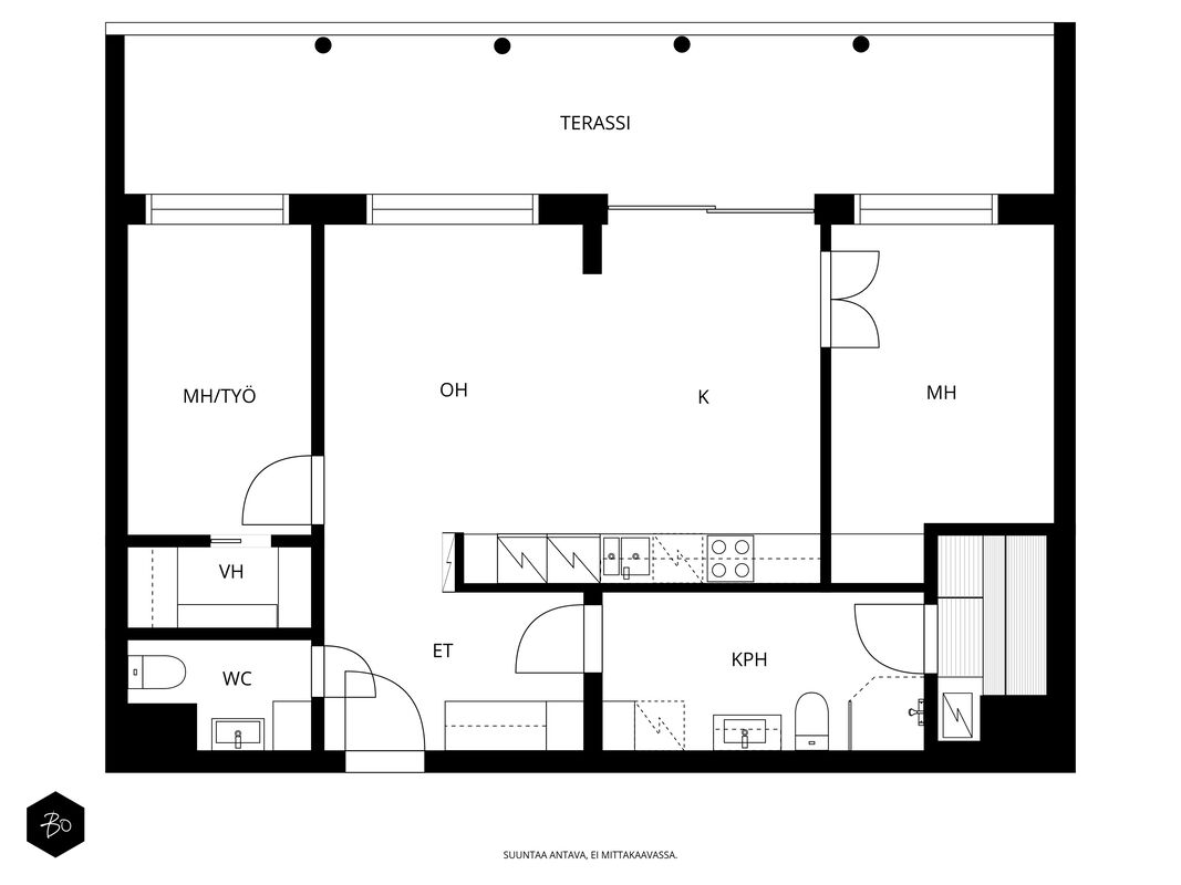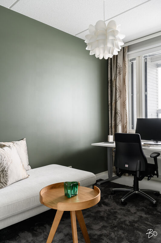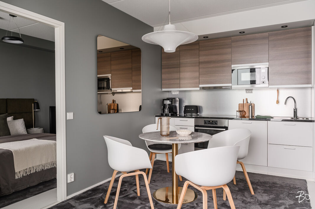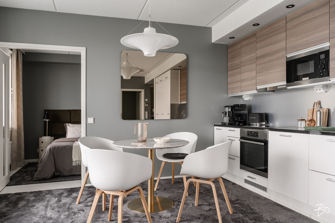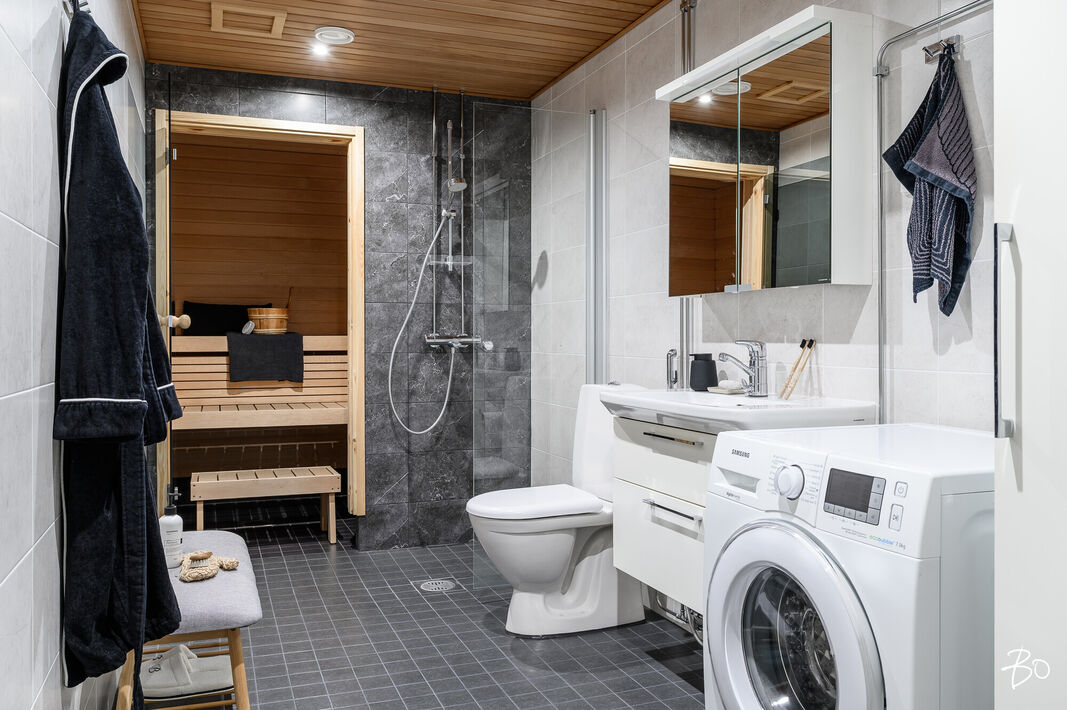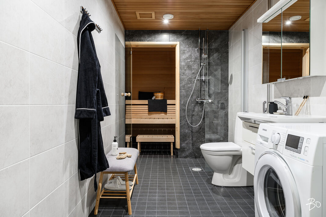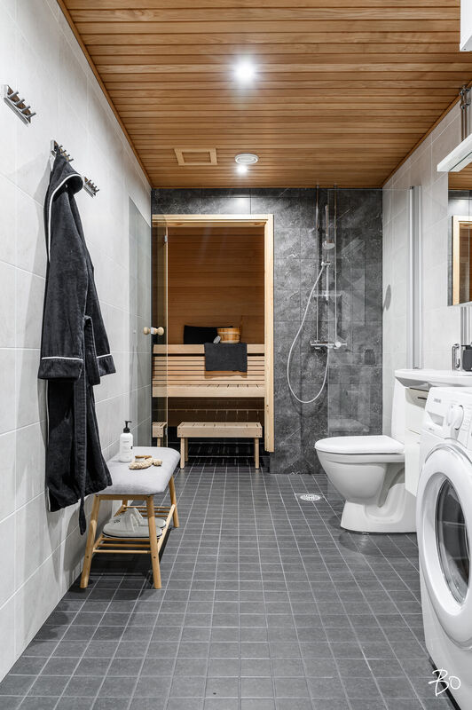 Tämä 67 neliöinen koti on uudehko ja pitää sisällään kaksi makuuhuonetta, yhtenäisen keittiön ja olohuoneen yhdistelmän sekä erinomaisesti varustetun kylpyhuoneen, josta löytyy myös tunnelmallinen sauna. Parasta tässä kodissa on ehdottomasti reilun kokoinen lasitettu parveke, jossa on huikeat näkymät! Kodin suuret ikkunat avautuvat etelään, joten luonnonvaloa kodissa riittää. Huoneiston vaalea värimaailma antavat vapaat kädet sisustamiseen. Kodissa on reilusti säilytystilaa; eteiseen yhdistyvät keittiön kaapistot ja makuuhuoneessa on kaapistot vaatteiden säilytykseen ja toisesta löytyy vaatehuone. Kodissa on myös erillinen wc.