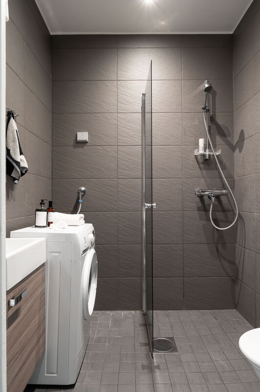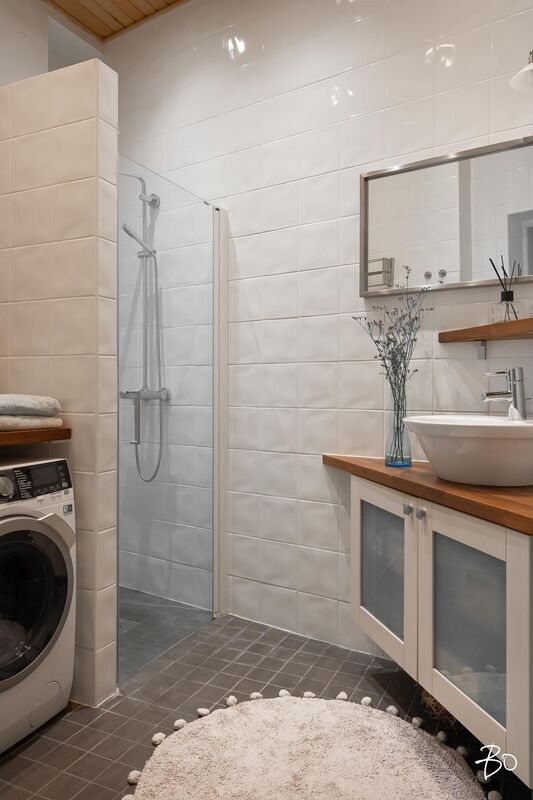 Tilava kylpyhuone, jonne mahtuu hyvin pesukone.