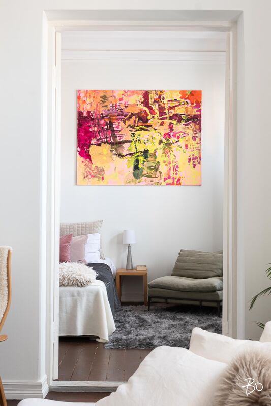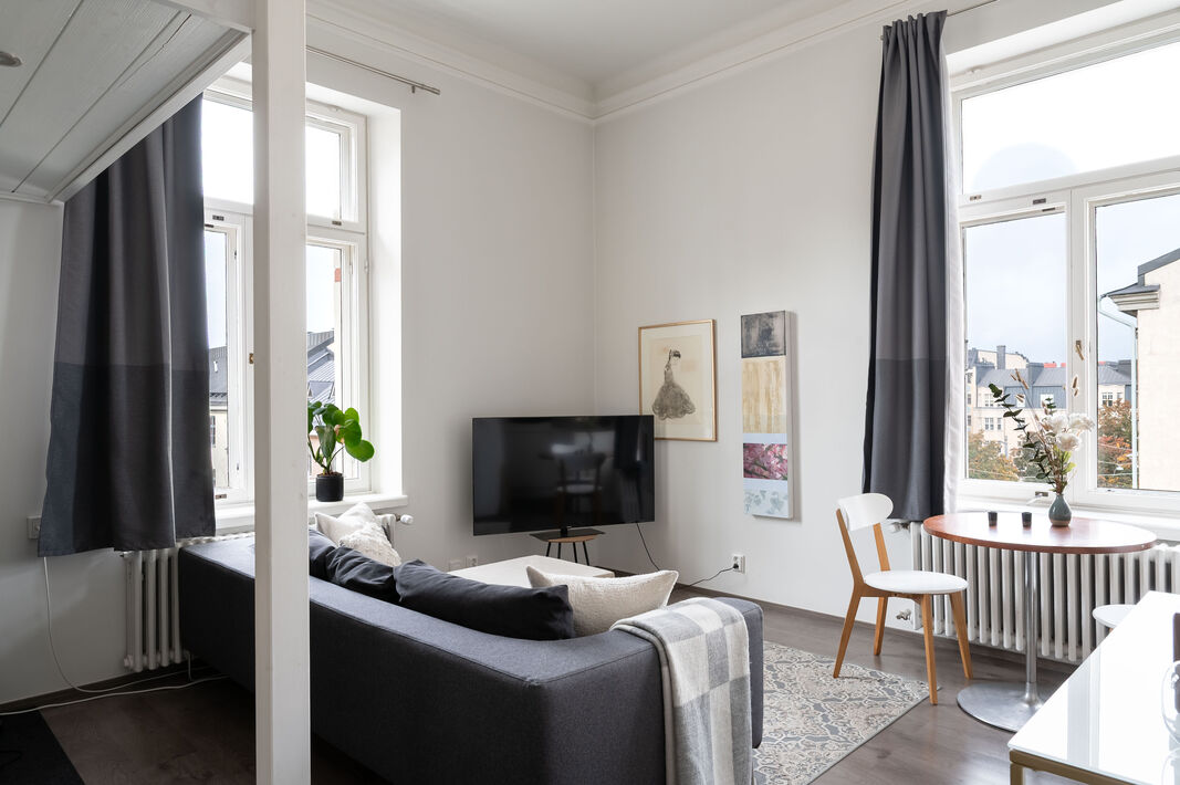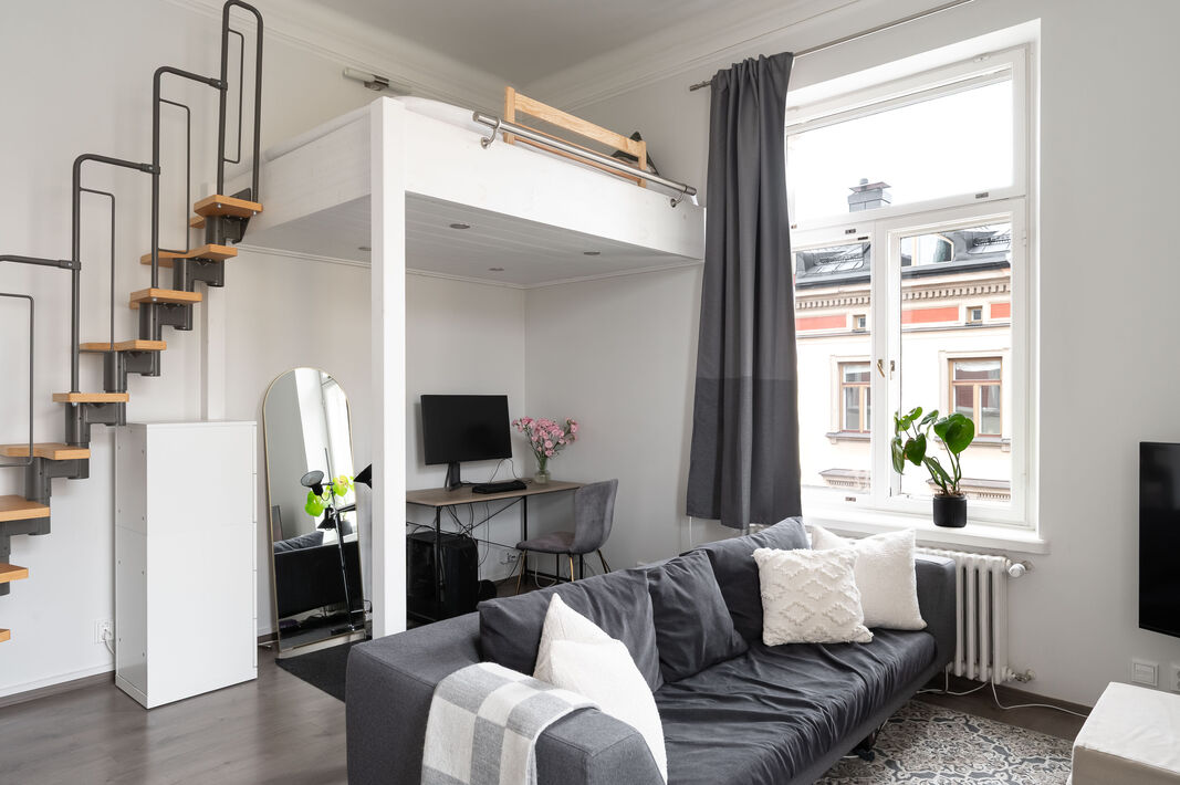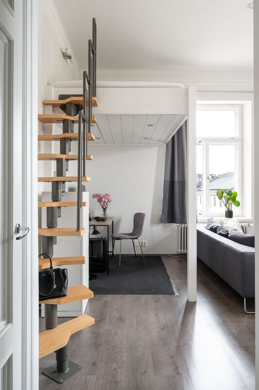 Valoisa kulmahuone, josta näkymä niin Fredalle kuin Merimiehenkadulle. Huoneessa parvi, jonka alle jää tilaa työpisteelle ja muutoin huonetila mahdollistaa oleskelun ja pienen ruokapöydän.