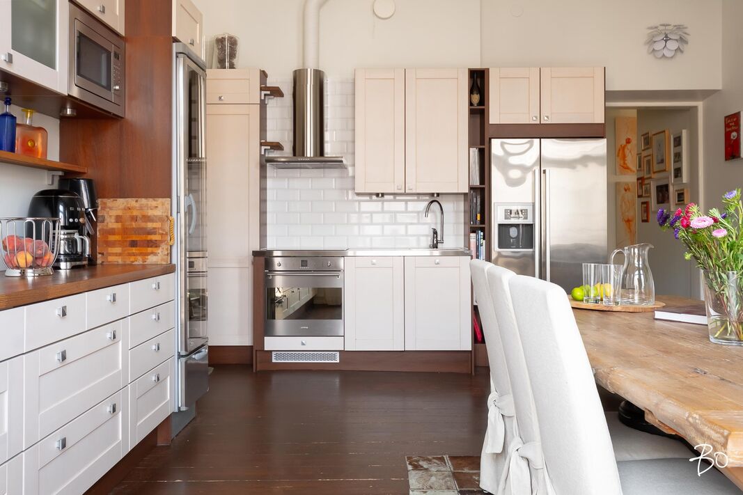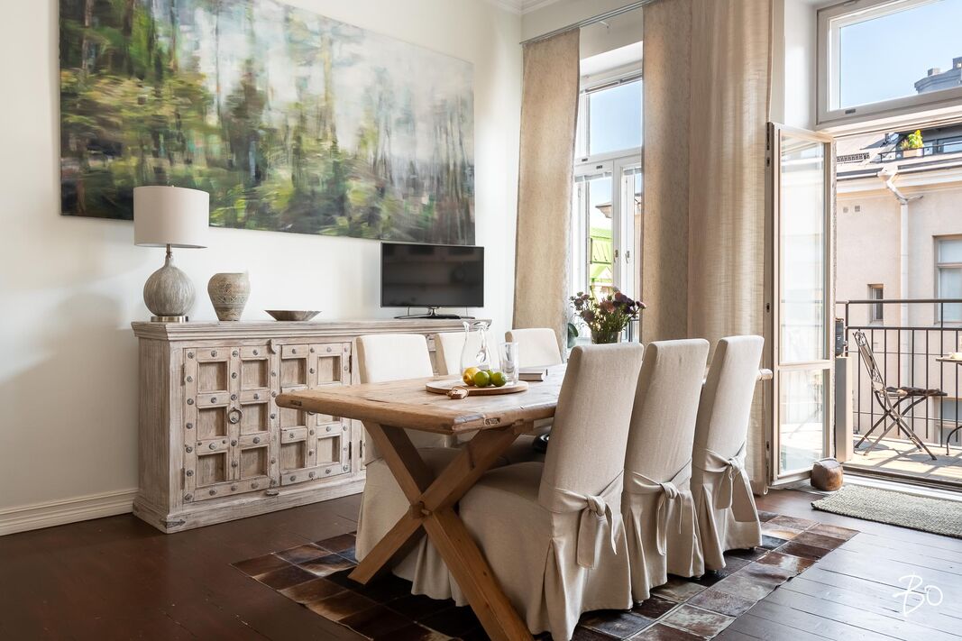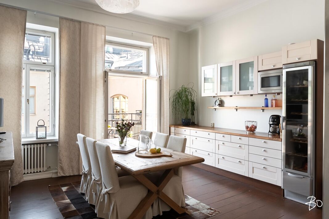 Moderni, tilava ja valoisa keittiö, jossa laadukkaat kodinkoneet: Smegin induktioliesitaso, uuni sekä mikroaaltouuni, AEG:n jääkaappi-pakastin yhdistelmä ja iso viinikaappi. Tilavaan keittiöön mahtuu iso ruokapöytä ja sieltä avautuvat ovet ihastuttavalle parvekkeelle, jossa voi nauttia kahvin aamuauringossa.