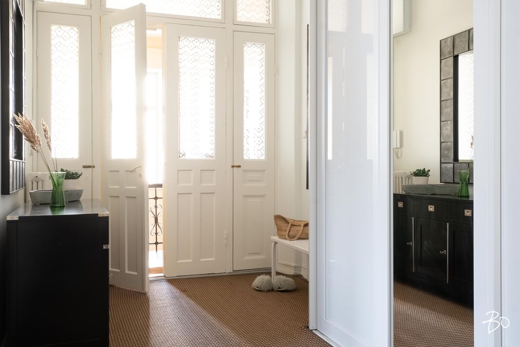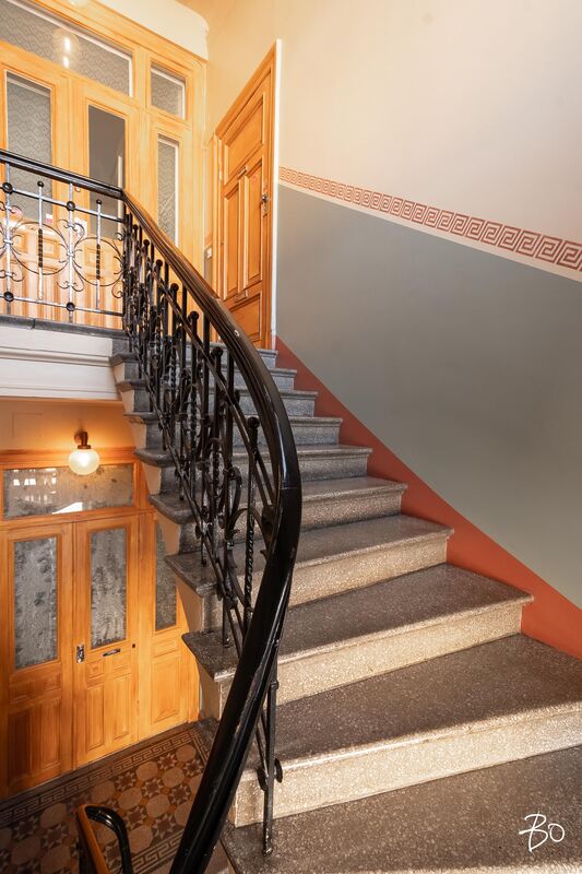 Valoisat rappukäytävät, huoneistojen lähes neljän metrin huonekorkeus, isot ikkunat ja leveät ikkunalaudat kuvantavat rakennuksen tyyliä ja aikakautta.