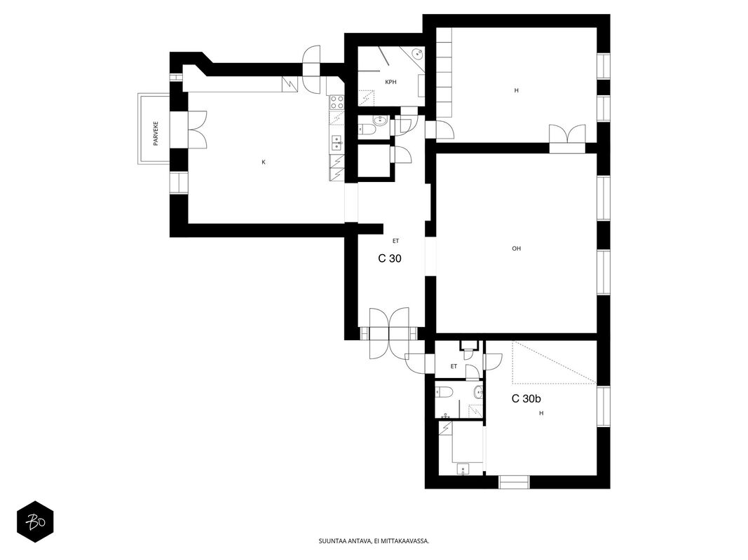 - huoneistoon käynti kahden rapun kautta (C ja F, kummassakaan ei hissiä)