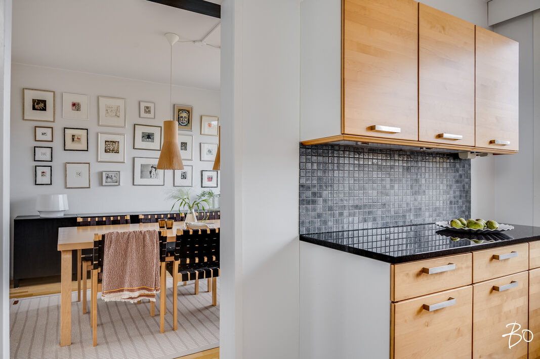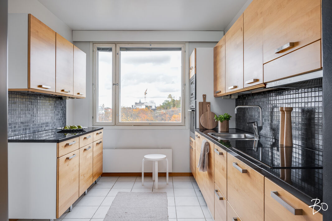 Keittiöremontista on jo aikaa, mutta se hurmaa edelleen modernilla ilmeellään sekä toimivilla ratkaisuillaan. Lattioita peittää osittain lämminsävyinen parketti ja osittain kaunis vaalea laatta.