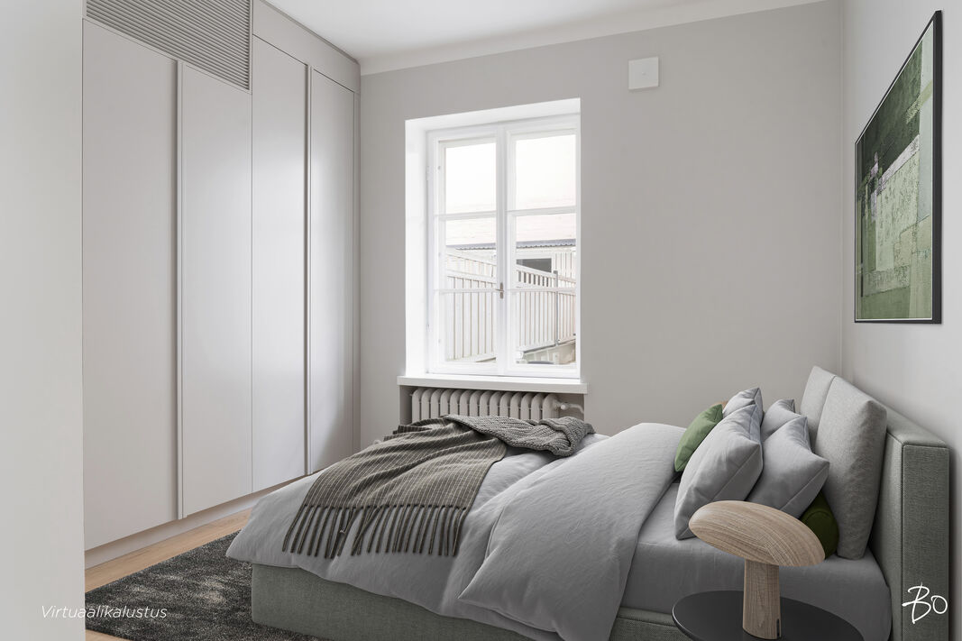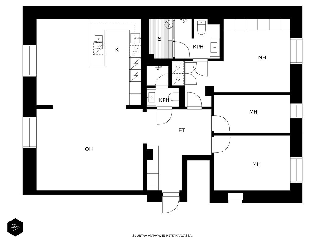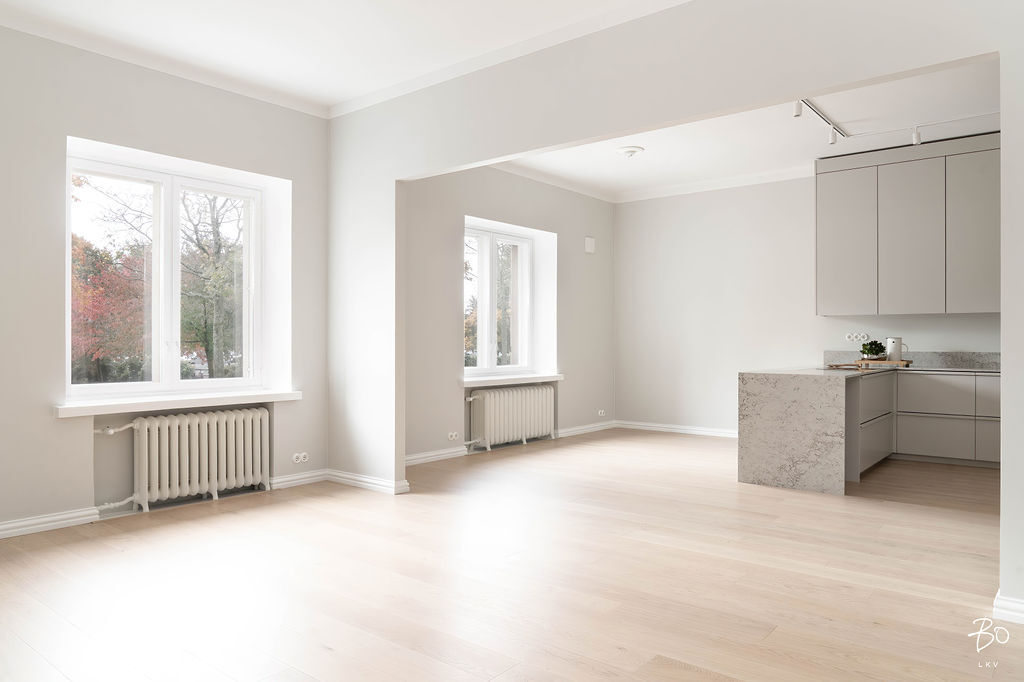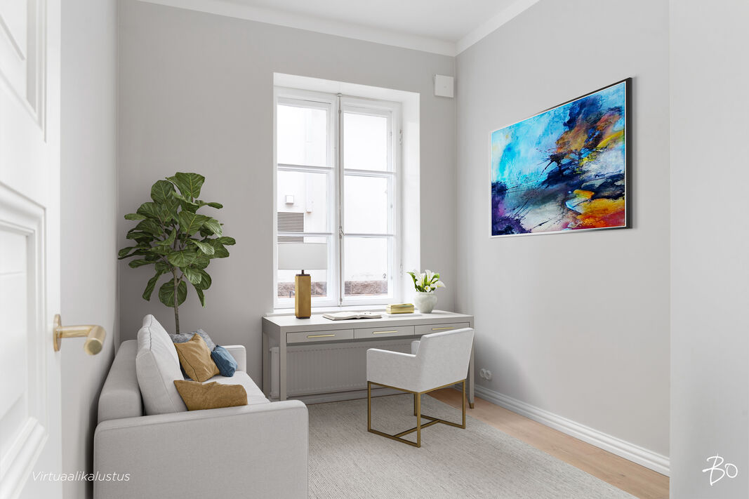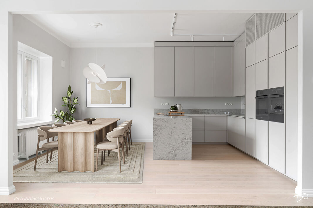 Upea ja selkeä pohjainen läpitalon asunto ensimmäisessä kerroksessa. Keittiö, ruokailutila ja oleskelutilat yhdistyvät suureksi kokonaisuudeksi. Olohuoneen ja keittiön lisäksi huoneistossa on sisäpihan puolella kolme makuuhuonetta. Asunnossa on kaksi kylpyhuonetta joista toisen yhteydessä on sauna.