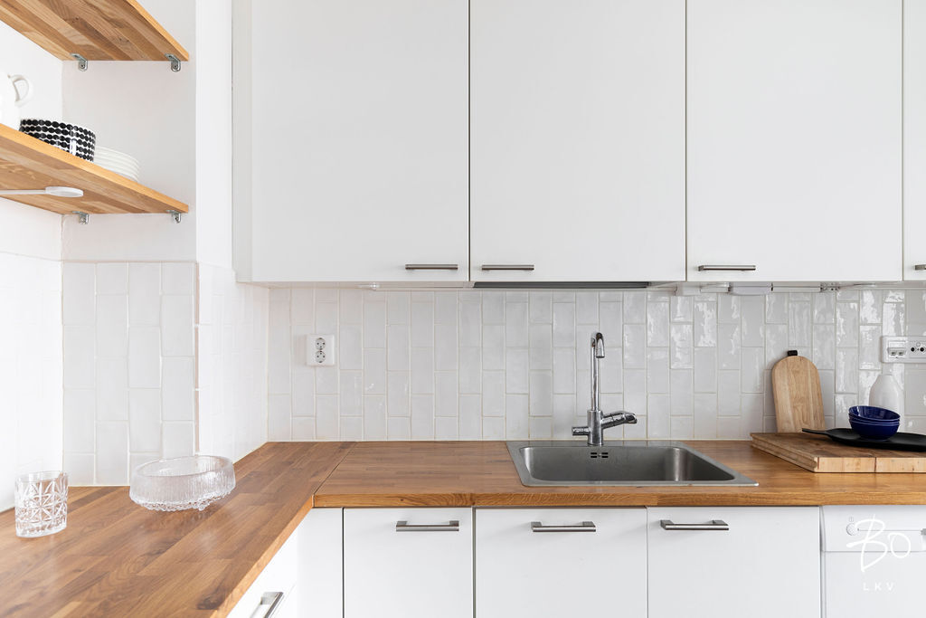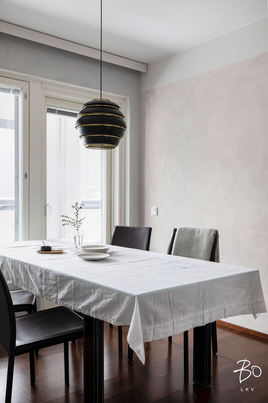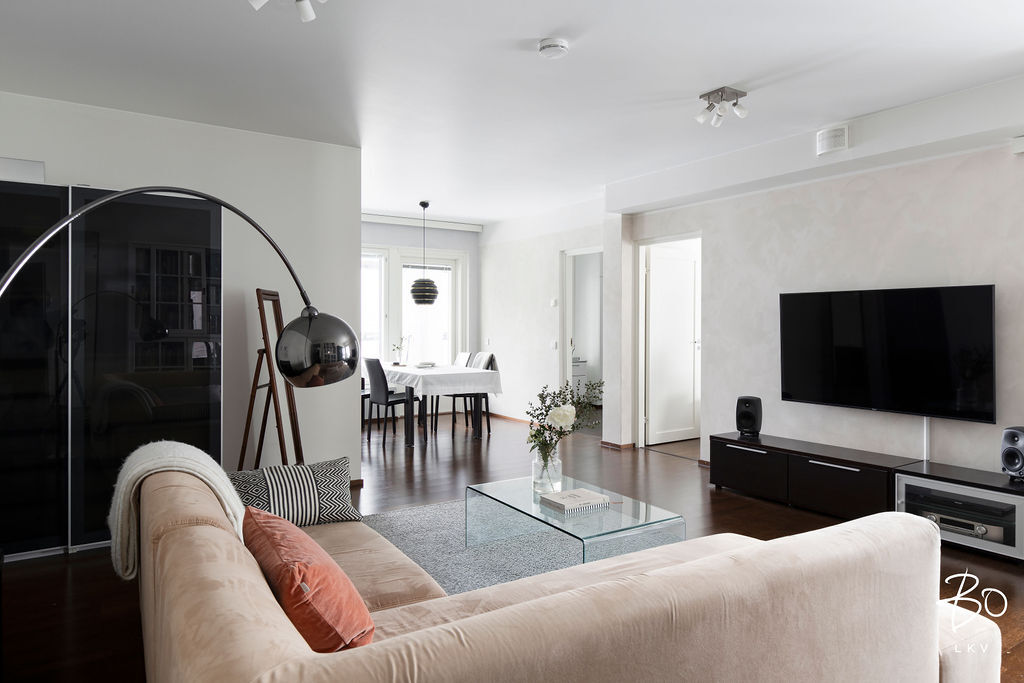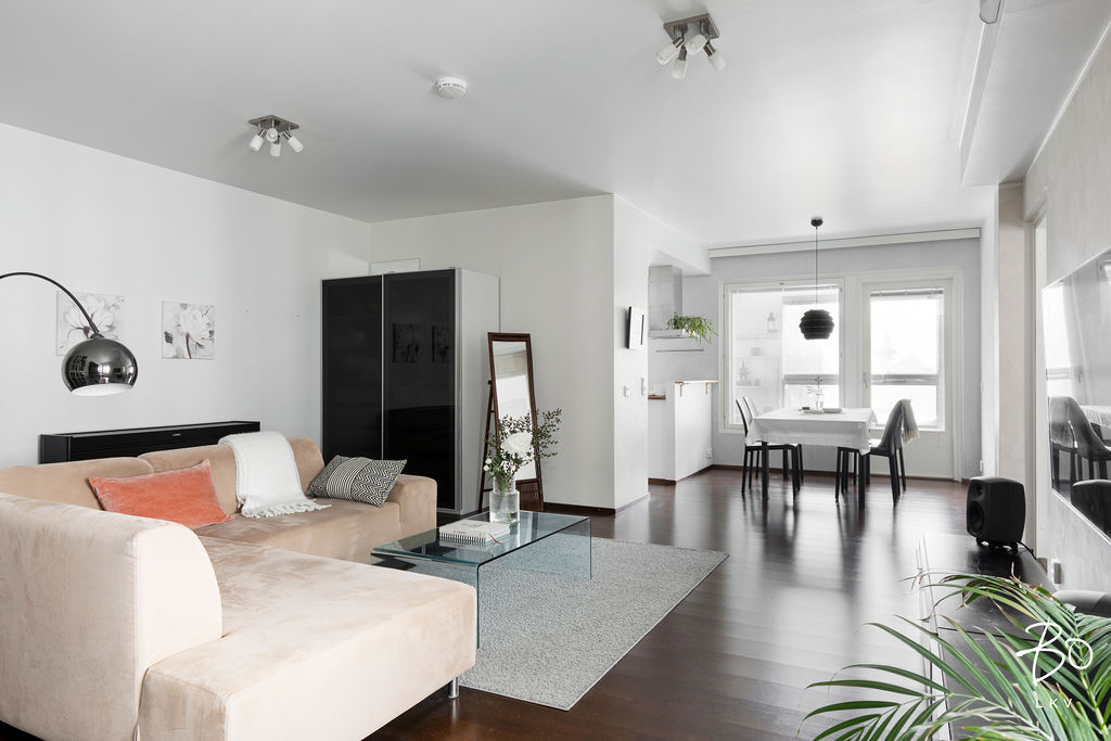 Viidennessä kerroksessa sijaitsevan asunnon sisustuksessa korostuu vaalea skandinaavinen tyyli, jossa selkeät linjat, laadukkaat materiaalit ja huolella valitut yksityiskohdat luovat modernin ja kutsuvan tunnelman.