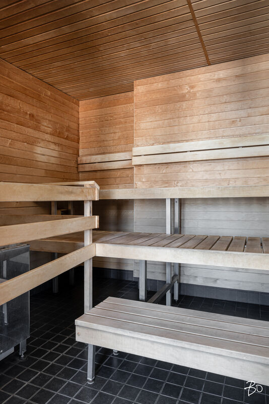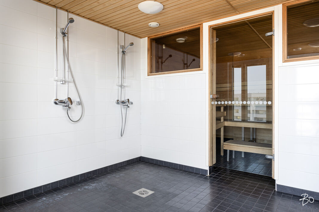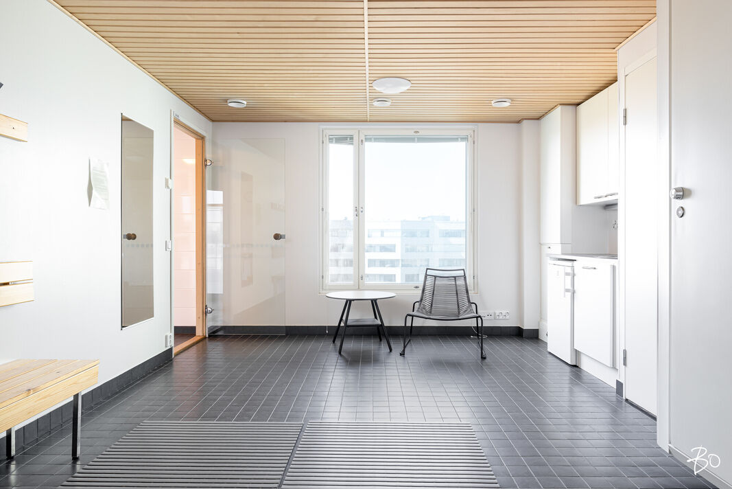 Saunaosasto on 8. krs. Kerhotila, pesutupa ja kuivaushuoneet ovat maksuttomia ja varattavissa netistä.