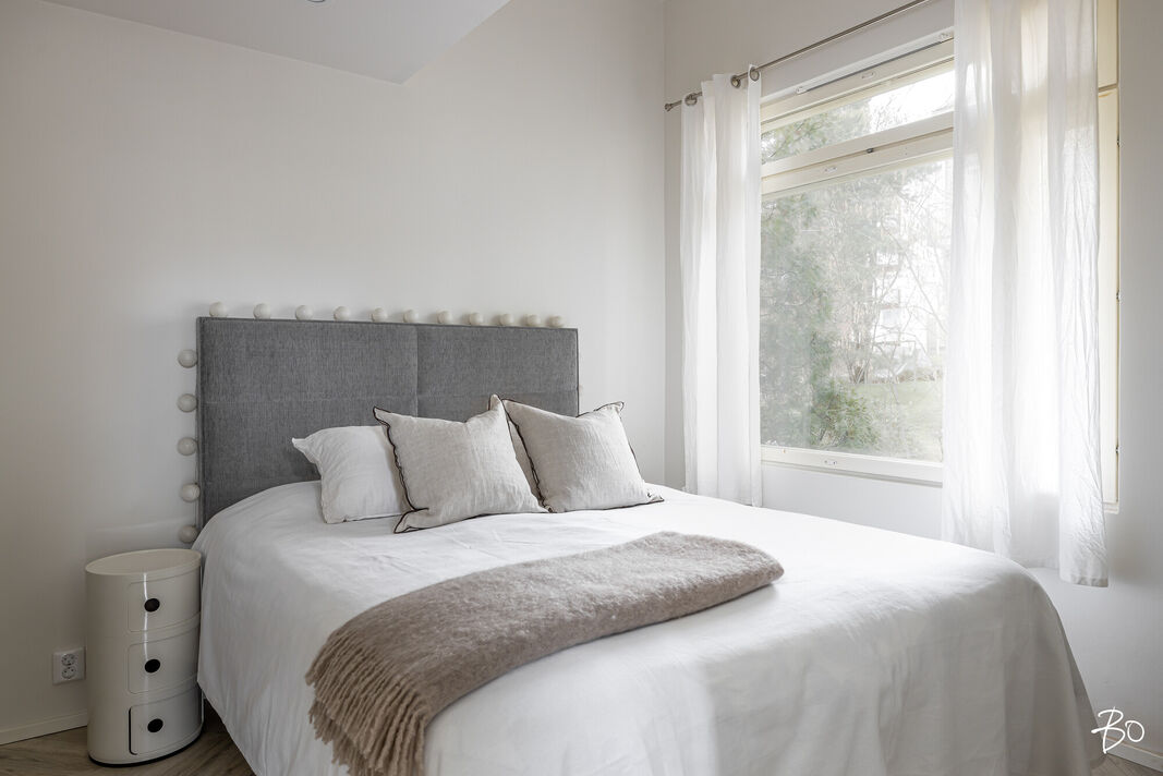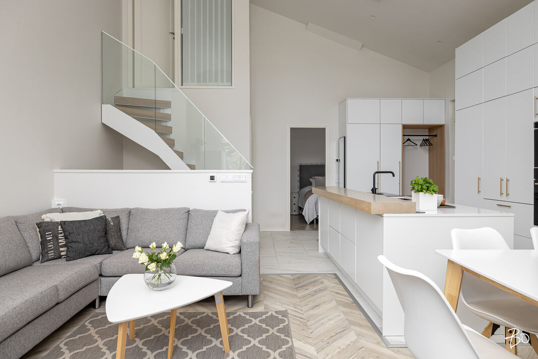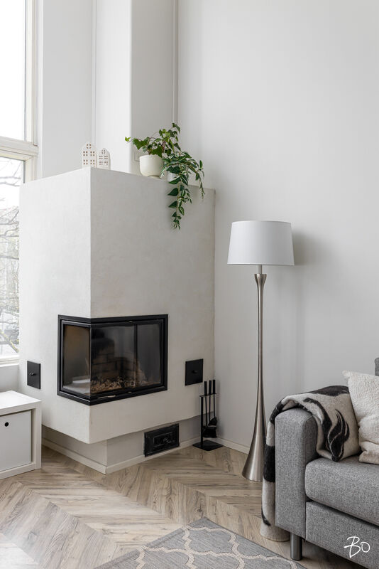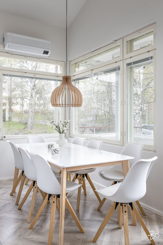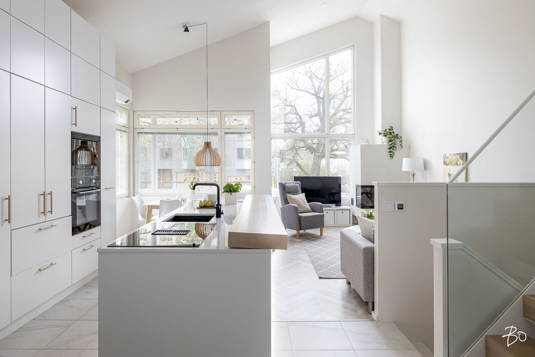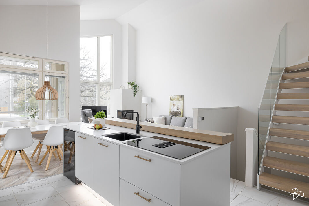 Kodin sydän on korkeaan tilaan avautuva olohuone, jossa luonnonvalo pääsee oikeuksiinsa. Skandinaavinen ilme ja huolella valitut materiaalit tuovat tilaan ajattomuutta ja selkeyttä. Huonejako tukee sekä omaa rauhaa että yhteistä aikaa, toimiva kokonaisuus, jossa asuminen mukautuu perheen eri vaiheisiin.