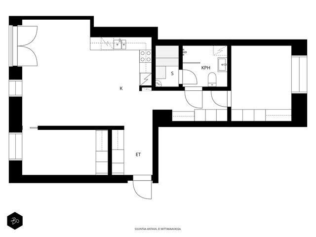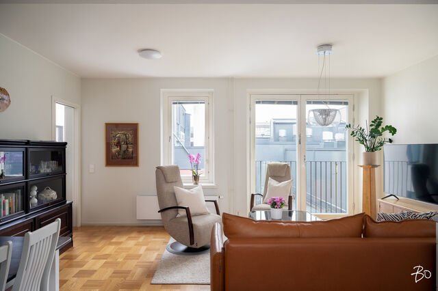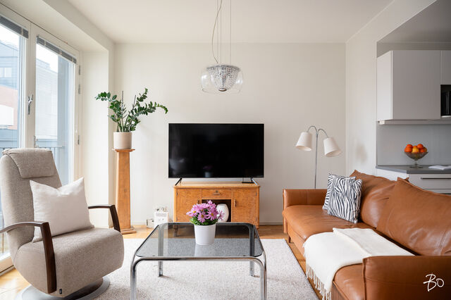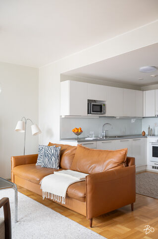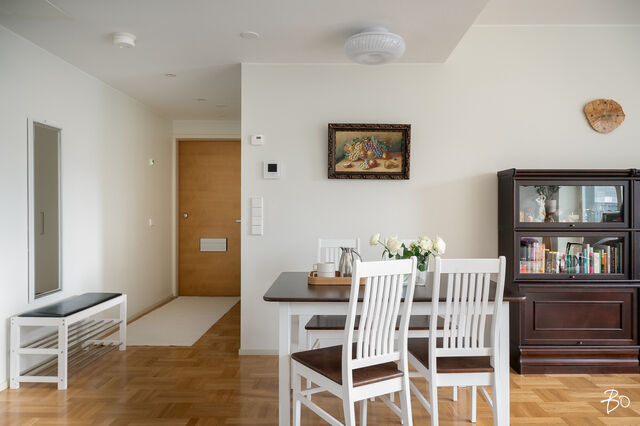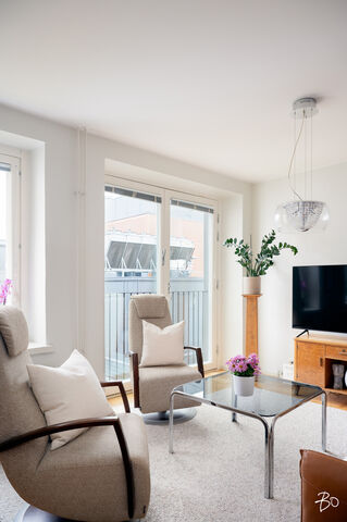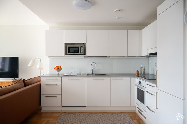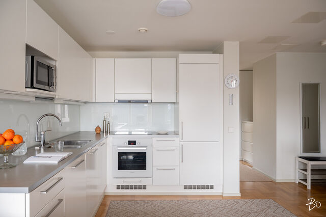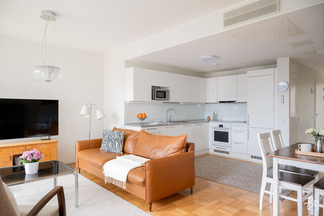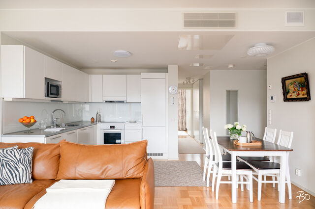 Asunnon sisätilat ovat vertaansa vailla: keittiö ja olohuone sulautuvat saumattomasti yhteen luoden modernin ja avoimen tilan, jossa vaaleat sisustussävyt korostavat avaruutta ja valoisuutta. Mukavat puitteet viihtyisään yhdessäoloon sekä arjessa että juhlassa. Kaikessa suunnittelussa on panostettu asumismukavuuteen; huoneistokohtainen ilmanvaihto ja koneellinen viilennys takaavat miellyttävän sisäilman ympäri vuoden. Kodin oma sauna ja tilava kylpyhuone on arjen sujuvuutta ja kaksi makuuhuonetta on sijoitettu asunnon eri puolille.