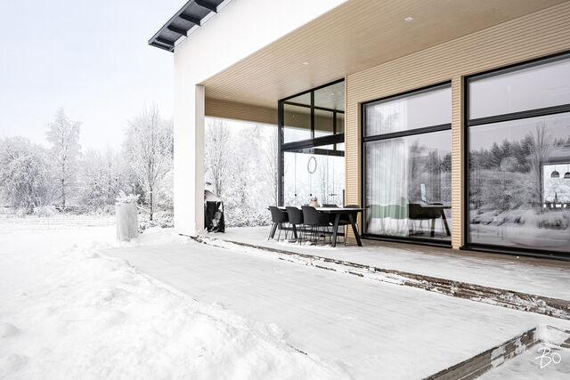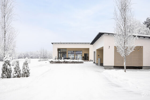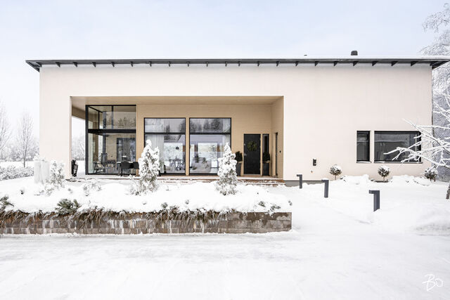 Tämä kaunis kuuden huoneen koti tarjoaa tilavat ja valoisat tilat, joissa saumattomasti yhdistyvät toiminnallisuus, esteettisyys sekä luonnon läsnäolo. Kodin sydämenä toimii korkea, avonainen olohuone-keittiö, joka luo avaran tunnelman ja tarjoaa kauniit näkymät ympäröivään maalaismaisemaan. Kaunis, valkoinen Puustellin keittiö on varustettu laadukkailla, integroiduilla kodinkoneilla sekä ilmavalla saarekkeella. Tilan skandinaavinen tyyli on mietitty huolella, painottaen vaaleita sävyjä ja luonnonmateriaaleja, jotka tuovat lisää valoa ja harmoniaa kotiin. Viisi aidosti tilavaa makuuhuonetta tarjoavat erinomaiset puitteet isommallekin perheelle tai antavat mahdollisuuden työhuoneiden ja vierashuoneiden muokkaamiseen tarpeidesi mukaan. Vaalean sisäsaunan vastakohta on tunnelmallinen, tumma Salvoksen ulkosauna. Nautiskelijoille lasitettu terassi tarjoaa erityisen rentoutumispaikan, jossa takkatulen lämmössä voi nauttia vuodenajasta riippumatta.