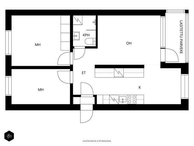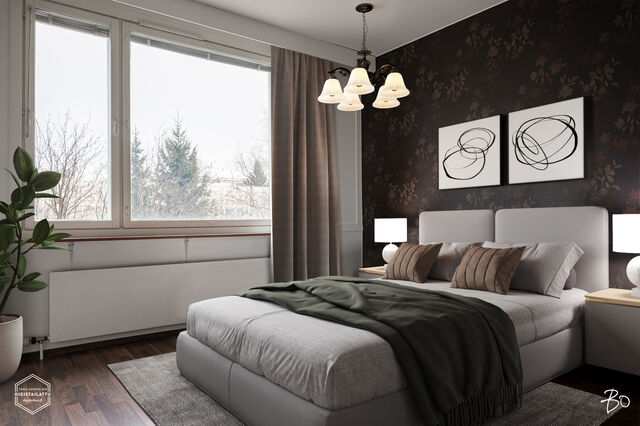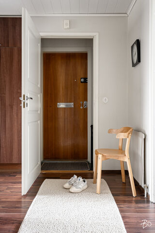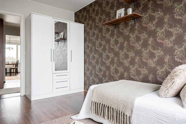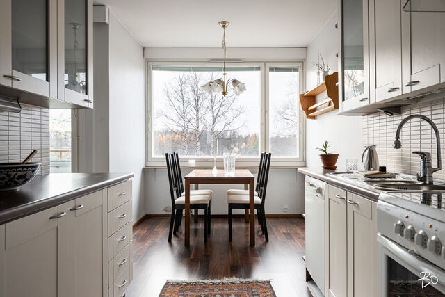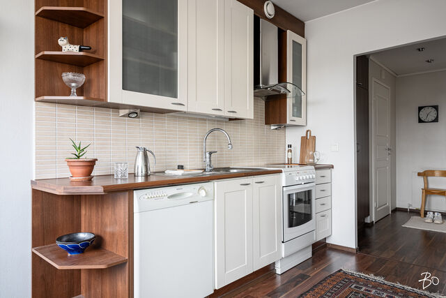Asunnon sisätilat ilahduttavat avaralla olemuksellaan. Kolmio pitää sisällään kaksi hyvänkokoista makuuhuonetta, erittäin toimivan keittiön sekä modernin kylpyhuoneen, jotka on kaikki remontoitu 2000-luvun aikana vastaamaan nykyajan asukkaiden vaatimuksia. Lasitettu parveke tuo mukavasti lisätilaa ja on mainio paikka rentoutumiseen vaikka aamukahvin äärellä. Parvekkeelta avautuu puistomaiset näkymät, ja pian näkyykin myös uusi jalkapallostadion!