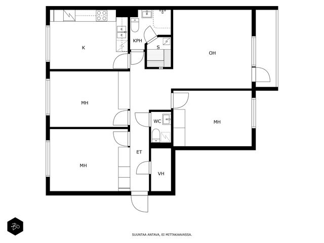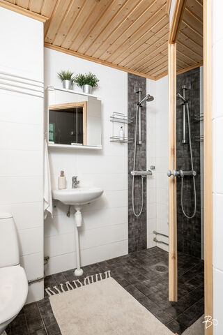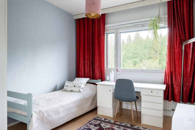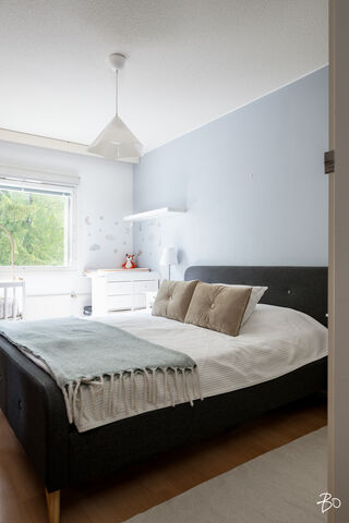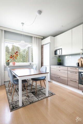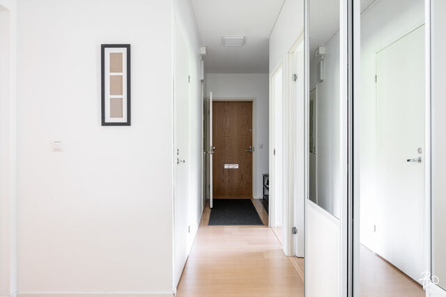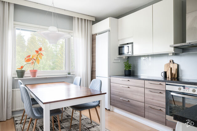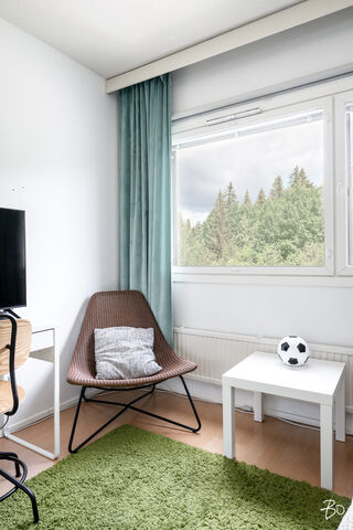 Tässä viehättävässä kodissa on kodikas ja seesteinen tunnelma. Isot läpitalon huoneiston ikkunat tuovat runsaasti luonnonvaloa tehden kodista entistäkin avaramman tuntuisen. Sisääntulon aulasta avautuu koti, jonka jokainen kolmesta makuuhuoneesta on tilava ja viihtyisä. Erilliseen keittiöön mahtuu mukavasti isokin ruokailuryhmä ja olohuoneesta on käynti lasitetulle parvekkeelle. Eteisen yhteydestä löytyy erillinen wc sekä vaatehuone.
