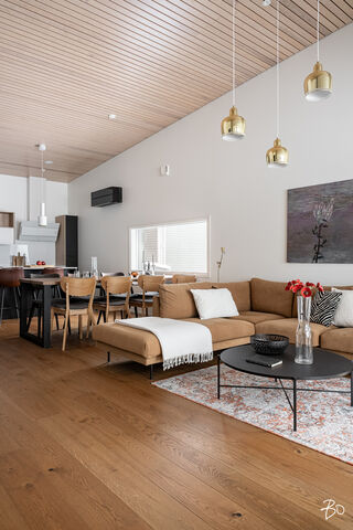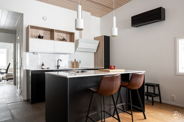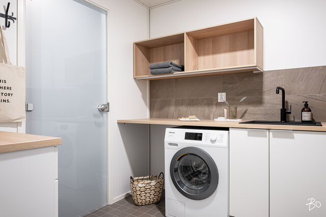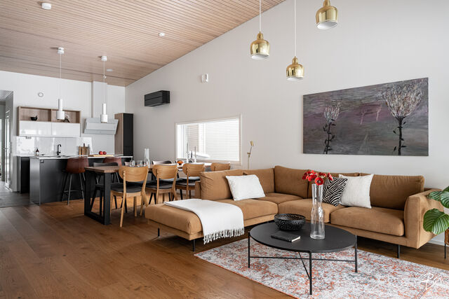Tässä kodissa on Topi-Keittiön keittiö, mistä löytyy laadukkaat kodinkoneet ja reilusti kaappi- sekä laskutilaa, tyyliä tähän keittiöön tuo kauniit pinnat ja monikäyttöinen aamiaiskaappi. Kodin kylpyhuoneessa on upeat pinnat, ja luksusta kylpyhuoneeseen tuo sadevesisuihku. Olohuoneessa on korkea huonekorkeus joka tuo valoa tähän kotiin. Kodista löytyy kaksi makuuhuonetta, josta yhdestä löytyy tilava vaatehuone. Kodista löytyy myös kodinhoitohuone ja erillinen wc.