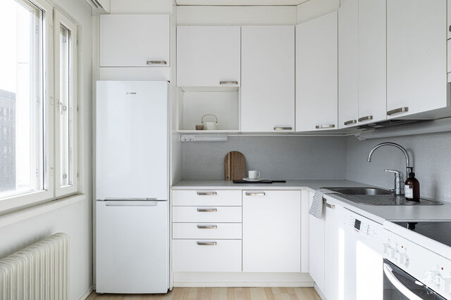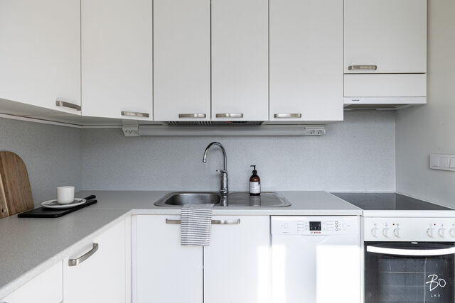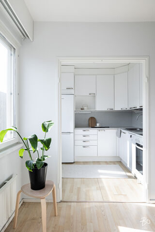 Olohuone on kodin sydän - viihtyisä paikka rentoutua ja viettää aikaa. Keittokomero on kompakti, mutta toimiva ja tarjoaa kaiken tarvittavan arjen ruoanlaittoon. Lasitettu parveke tuo mukavasti lisätilaa ja toimii kivana paikkana hengähtää hetki.