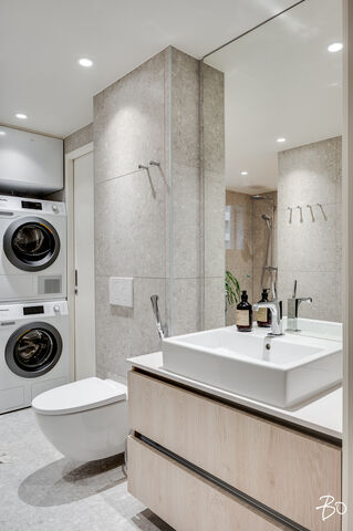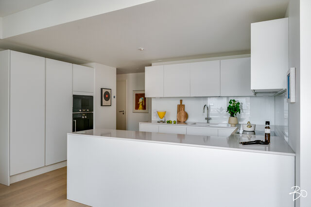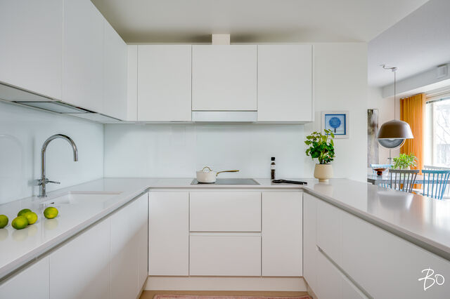 Keittiössä jääkaappi, pakastin, astianpesukone, induktioliesi, liesituuletin, kalusteuuni, mikroaaltouuni ja komposiittiallas. Tasot Kvartsia.