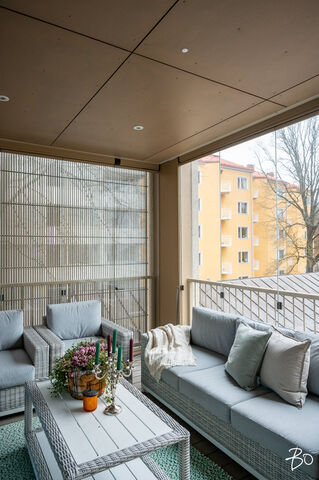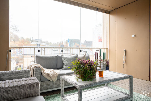 Tilava lasitettu parveke tarjoaa upeat puistomaisemat Aurajoen toiselle puolelle yli suojeltujen arvorakennusten.