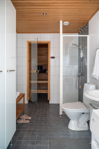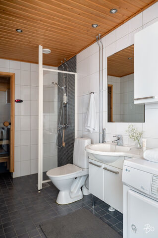 Huoneistossa on oma sauna ja kylpyhuone, jossa on kodinhoitotilaa eli paikka pesutornille ja pyykki-/siivouskaapille. Molemmat sekä sauna että kylpyhuone ovat siistissä kunnossa ja ne eivät kaipaa vielä hetkeen remonttia.