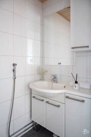 10 x 10 lattialaatat. Peili, valkoinen korkeakiiltoinen pystykaappi, valkoinen korkeakiiltoinen allaskaapisto. Wc-istuin, uusittu 2022.