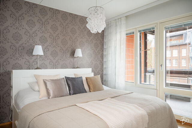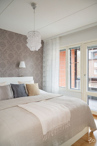 Päämakuuhuoneen seinät on maalattu valkoiseksi/yhdellä seinistä on tehostetapetti. Toisen makuuhuoneen katto on valkoiseksi maalattu betonikatto. Seinät on maalattu valkoiseksi/yhdellä seinistä on tehostetapetti. Molempien makuuhuoneiden lattioissa on tammiparketti. Molemmissa makuuhuoneista on liukuovikaapistot.