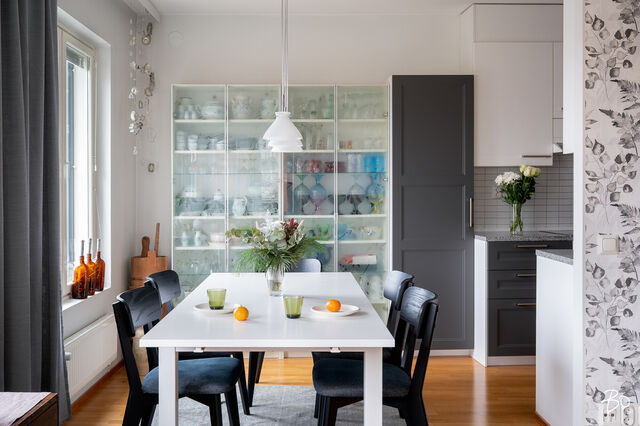 Olohuone ja ruokailutila sekä keittiö luovat kodin sydämen ja nivoutuvat kivasti toisiinsa. Olohuoneesta on käynti myös isommalle lasitetuista parvekkeista, jonka sisustusta pääsee vaihtelemaan vuodenaikojen mukaan. Talviaikaan lasitetulle parvekkeelle saa rakenneltua pienen talven ihmemaan valoineen, sypresseineen ja kanervineen. Kesällä taas lasitettu parveke on kuin