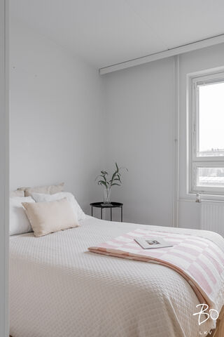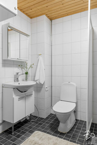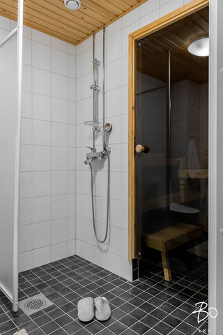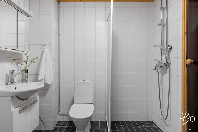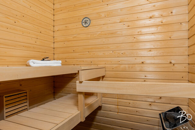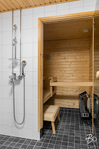 Kodin pintamateriaalit ja kalustevalinnat ovat ajattomia. Makuuhuone on hyvänkokoinen ja kylpyhuone on selkeälinjainen ja tilava. Oma sauna on arjen luksusta.