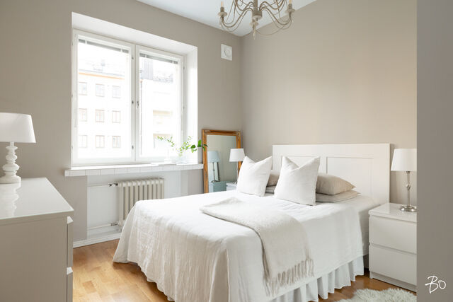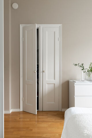 Makuuhuone on rauhallisen sisäpihan puolelle ja sieltä löytyy mukavasti säilytystilaa komeroiden ja liukuovikaapistoiden ansiosta.