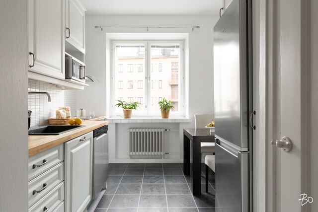 Keittiöön saa sijoitettua näppärästi ruokapöydän ja kaikki kodinkoneet, allas sekä tammipöytätaso on vastikään uusittu.