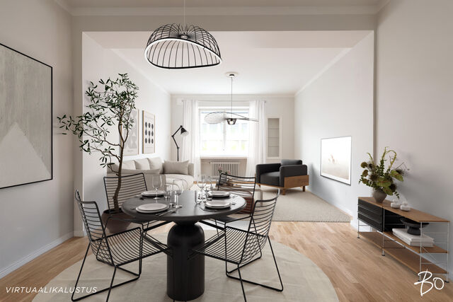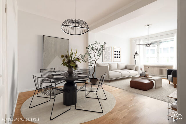 Olohuone sijoittuu Mannerheimintien puolelle mutta 2020 uusitut ikkunat eristävät liikenteen äänet lähes olemattomiin.