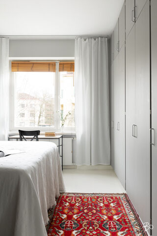Makuuhuone on reilun kokoinen ja säilytystilaa löytyy lähes koko seinän mittaisista vaatekaapeista sekä eteisen liukuovikaapistoista. Lisäksi huoneistolle kuuluvat omat komerot sekä kellarissa että vintillä.