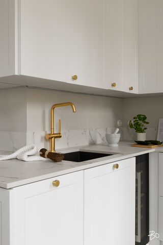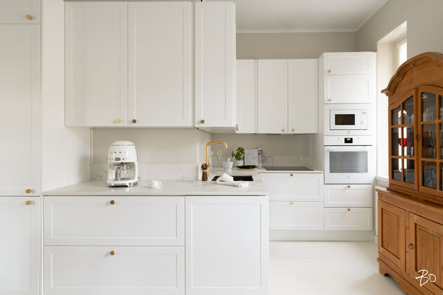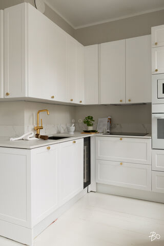 Tyylikkäässä ja erinomaisesti suunnitellussa keittiössä on integroidut kodinkoneet, viinikaappi sekä ruhtinaallisesti kaappi- että laskutilaa.
