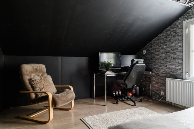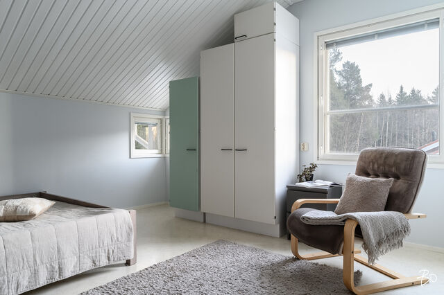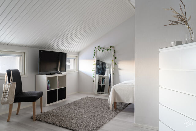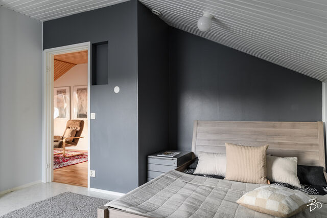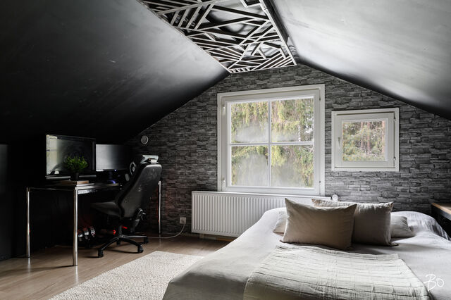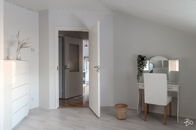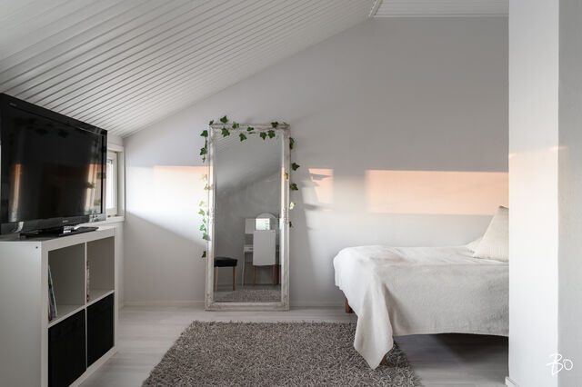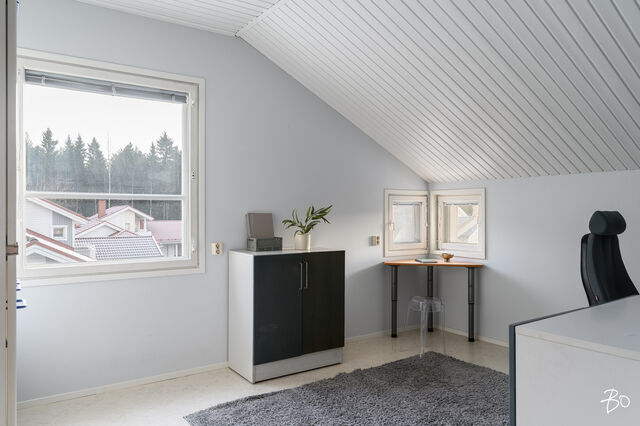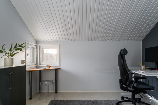 Yläkerrassa vastaan ottaa iso aulatila, johon on mahdollisuus rakentaa halutessaan vaikka kodille toinen keittiö. Yläkerrassa virallisia makuuhuoneita on kolme kappaletta, mutta esim. myöhemmin rakennettu ullakkohuone toimii tarvittaessa neljäntenä, epävirallisena makuuhuoneena. Yläkerrassa on myös remontoitu kylpyhuone sekä iso tilava varastohuone, johon mahtuu tavaraa säilöön!