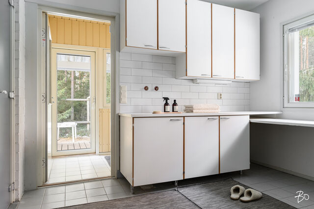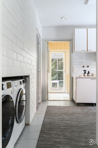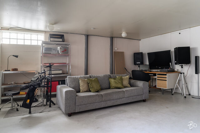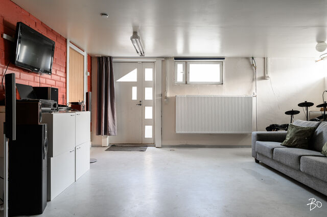 Kodin yksi iso valttikortti on ehdottomasti tilava, moneen taipuva kellaritila, joka menee niin harrastehuoneesta kuin työtilasta. Tänne on oma erillinen kulku talon sivulta. Ulkona lisäksi odottaa useita pihavarastoja, jonne saa niin pyörät, halot kuin nurmileikkurit talteen. Autotallikin löytyy ja pihalle mahtuu useampi auto pysäköimään.