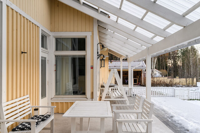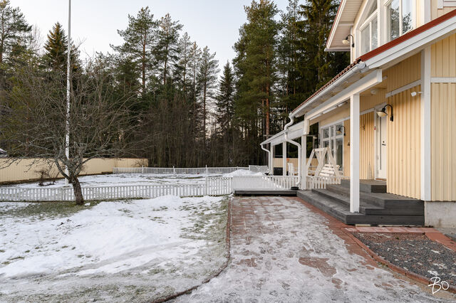 Kodin piha on täynnä tilaa temmeltää ja toteuttaa vaikka minkälaisia puutarhaunelmia! Sekä talon edessä että takana on isot nurmialueet odottamassa seuraavia leikkijöitä. Talon sijainti tien päässä, puistoalueeseen rajoittuen, on turvallinen ja aivan omassa rauhassa.