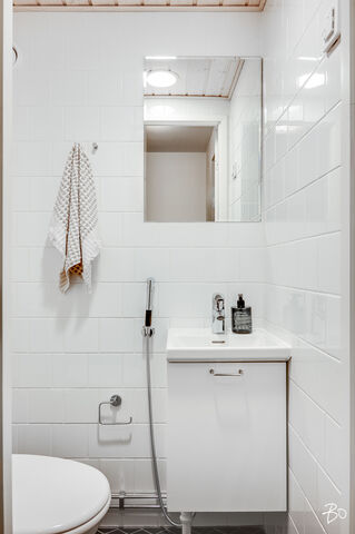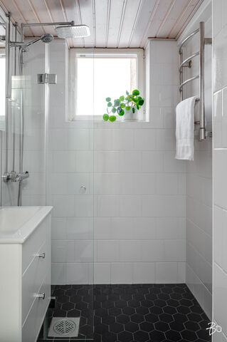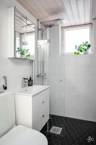 Varutelu: suihku, wc-istuin, allas, allaskaappi, peilikaappi, sähköinen pyyhkeenkuivain, lattialämmitys.