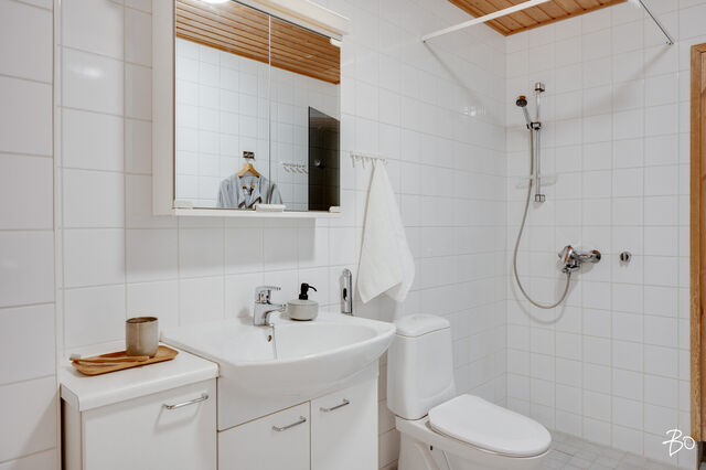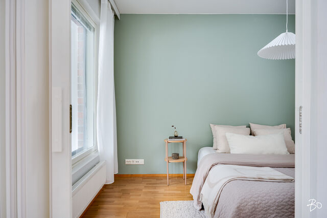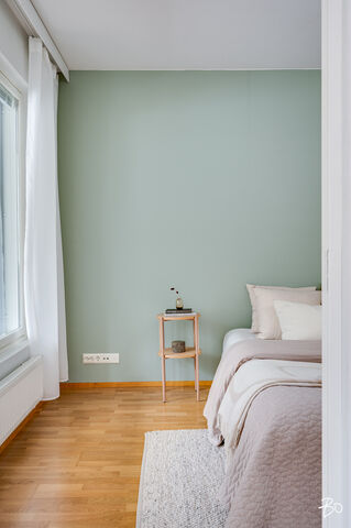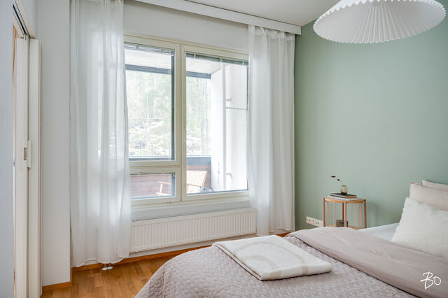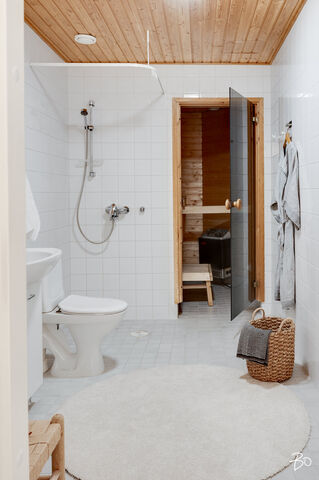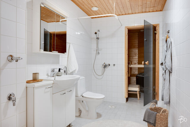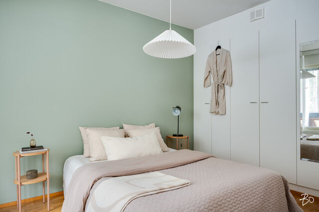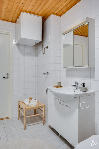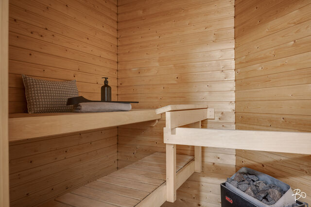 Makuuhuone on reilun kokoinen ja varustettu koko seinän mittaisilla kaapistoilla. Kylpyhuone on siisti ja käytännöllinen, ja siellä on hyvin tilaa myös pesukoneelle. Oman saunan ansiosta voit nauttia rentouttavista löylyistä juuri silloin kun sinulle sopii.