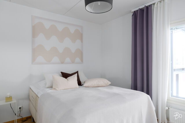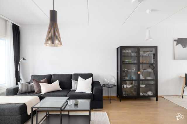 Vaaleasävyinen ja kaunis kaksio hurmaa heti sisään astuttaessa. Asunnon yleisilme on rauhallinen ja moderni, ja tilat tuntuvat neliöitään avarammilta selkeän pohjaratkaisun ja runsaan luonnonvalon ansiosta.