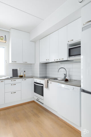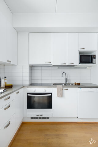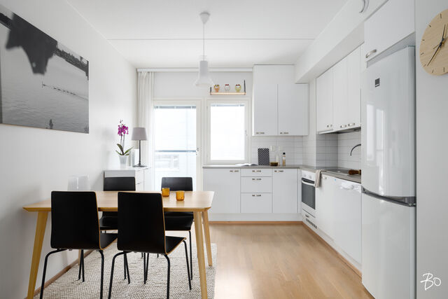 Keittiö sijaitsee olohuoneen jatkeena, mikä tekee kokonaisuudesta toimivan ja kokatessa voi seurustella ystävien tai perheen kanssa. Vaalea kaapisto, modernit kodinkoneet ja selkeät linjat luovat ajattoman pohjan arjen ruoanlaittoon, ja keittiöön mahtuu myös ruokapöytä.