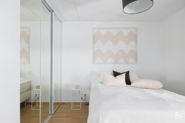 Makuuhuone on viihtyisä ja rauhallinen. Säilytystilaa löytyy peilivaatekaapeista, ja huoneen vaalea värimaailma tekee siitä helposti muunneltavan erilaisiin sisustustyyleihin.