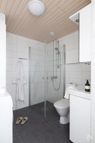 Kylpyhuone on tilava ja nykyaikainen. Laatoitetut pinnat, kääntyvä suihkuseinä, pesukoneliitäntä ja kiinteät valaisimet tekevät tilasta toimivan ja viimeistellyn kokonaisuuden. Taloyhtiössä on lisäksi sauna asukkaiden käytössä.