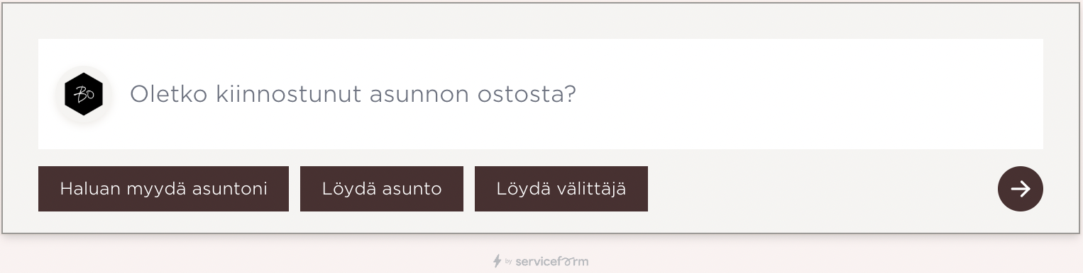 THIS IS WHERE THE STORY BEGINS. Kun olet ostamassa, myymässä tai rakennuttamassa, olemme mukanasi aloittamassa uutta tarinaa. Meiltä saat asiantuntevaa palvelua raikkaalla asenteella, tyylillä, luotettavuudella ja suurella sydämellä. Olemme alan edelläkävijöitä ja kehitämme jatkuvasti uutta, jotta voimme tarjota asiakkaillemme enemmän kuin kukaan muu Suomessa. 3700+ välitettyä kohdetta vuonna 2025 200+ Ammattilaista palveluksessasi 16 Toimistoa Suomessa ja ulkomailla 95% Asiakkaistamme suosittelee meitä Varaa arviokäynti kalenteristamme Ajanvarauskalenteristamme varaat maksuttoman tunnin arviokäynnin sinulle sopivaan aikaan. Voit myös varata 15 minuutin puhelinajan keskustellaksesi välittäjän kanssa kotisi myyntiin liittyvistä kysymyksistä. Aloita valitsemalla alueesi ja näet heti vapaat ajat. Valitse alue EspooHämeenlinnaHankoHelsinkiKuopioJyväskyläLahtiLevi / YlläsOuluPoriPorvooTampereTurkuVantaaUusikaupunki Bo kiihdyttää kohti seuraavaa kasvuloikkaa Bon uudistettu kasvustrategia yhdistää ainutlaatuisella tavalla teknologian, tekoälyn, inhimillisyyden, laadukkaan muotoilun ja alan parhaat osaajat. Mukaan liittyy nyt kolme kansainvälisestikin todella kovatasoista vahvistusta, joiden myötä rakennamme jatkossa seuraavan sukupolven kiinteistönvälitystä. Lue lisää Löydä kotisi auringosta Toteutamme asumisen unelmasi myös Aurinkorannikolla asiantuntevasti, luotettavasti ja suurella sydämellä. lue lisää Ajassa 2026 LUE LISÄÄ Palvelut asunnon myyjälle 200 huippuvälittäjää palveluksessasi 200 huippuvälittäjää palveluksessasi Suomen parhaimpiin ja arvostetuimpiin kuuluvat Bo:n välittäjät ja yhteistyöyrittäjät hoitavat asuntosi myyntityön amm… Näin myymme asuntosi Näin myymme asuntosi Tarjoamme asunnon myyntiin palvelukonseptin, joka nostaa asuntosi arvoa, mahdollistaa nopean myyntiajan sekä parhaan … Asunnon stailaus Asunnon stailaus Panostamme jokaiseen meille myyntiin tulevaan asuntoon, jotta voimme saavuttaa sen myynnissä parhaat tulokset. Asiakasedut Asiakasedut Haluamme tarjota sinulle enemmän ja ilahduttaa myös kauppojen jälkeen, olitpa asunnon myyjä tai ostaja. Olemme koonne… Bo App Bo App Bo App -palvelumme avulla tiedät koko ajan, missä vaiheessa asuntosi myynti on – myös silloin, kun et ole suoraan yht… Asunnon hinta-arvio ja arviokäynti Asunnon hinta-arvio ja arviokäynti Mitä hinta-arvio maksaa tai miten arviokäyntiä varten kannattaa valmistautua? Katso vastauksemme usein kysyttyihin ky… Mistä tunnistaa hyvän kiinteistönvälittäjän? Mistä tunnistaa hyvän kiinteistönvälittäjän? Kokosimme avuksesi meistä tärkeimmät ominaisuudet hyvän kiinteistönvälittäjän tunnistamiseen. Sisustussuunnittelu Onko sinulla paljon ideoita, mutta ei täyttä varmuutta toteutuksesta? Sisustuskonsultaation avulla löydät tyylisi ja saat neuvoja kodin pieniin ongelmakohtiin, kuten tilojen toimivuuteen, materiaalivalintoihin, sävymaailmaan tai kalusteiden uudelleen järjestämiseen. Tutustu Palvelut asunnon ostajalle Myytävät asunnot Myytävät asunnot Unelmiesi asunto voi olla jo myynnissä. Välitämme vuosittain tuhansia asuntoja yksiöistä arvokohteisiin kymmenillä pa… Sneak Peek® Sneak Peek® Sneak Peek® -palvelumme on askeleen edellä! Löydä alueesi uusimmat ja upeimmat asunnot jo ennen kuin ne ilmestyvät as… Uudiskohteet Uudiskohteet Uudiskohteidemme joukosta löydät suunnitteilla ja rakenteilla olevat, juuri valmistuneet sekä upeasti saneeratut asun… Loma-asunnot Loma-asunnot Tunnemme mökkikaupan erityispiirteet sekä ostajien unelmat. Tutustu palveluumme sekä myynnissä oleviin loma- sekä vap… Bo Match Bo Match Kun asuntounelmat ja unelmien asunnot kohtaavat, syntyy Bo Match. Tutustu uudenlaiseen tapaan käydä asuntokauppaa. Asiakasedut Asiakasedut Haluamme tarjota sinulle enemmän ja ilahduttaa myös kauppojen jälkeen, olitpa asunnon myyjä tai ostaja. Olemme koonne… Bo Business luo kiinteistöistä unelmia Bo Business tarjoaa Suomen korkeatasoisimmat markkinointipalvelut ja 3D-visualisointiratkaisut rakennuttajille, kiinteistönomistajille ja -sijoittajille. Tutustu yrityspalveluihin Palvelut yrityksille 3D-visualisoinnit ja havainnekuvat 3D-visualisoinnit ja havainnekuvat Visualisoinnit, animaatiot ja virtuaalitodellisuus herättävät hankkeen eloon jo kauan ennen sen valmistumista. Video- ja valokuvaustuotannot Video- ja valokuvaustuotannot Tarjoamme asunto- ja kiinteistökuvausta ympäri Suomen, tilojen virtuaalistailauksia sekä 3D-virtuaaliesittelyjä. Konseptointi ja brändäys Konseptointi ja brändäys Kiinteistöalalla jokainen kohde on uniikki tuote, minkä johdosta niille on tärkeää rakentaa myös uniikki brändi. Markkinointimateriaali Markkinointimateriaali Herätämme brändisi eloon huippulaadukkaasti tuotetuissa graafisissa markkinointimateriaaleissa. Kohdemarkkinointi ja liidigenerointi Kohdemarkkinointi ja liidigenerointi Miten, missä ja kuinka hyvin kohteesi näkyy ja kuuluu? Lisää boostia markkinointiin! Uudiskohdemyynti Uudiskohdemyynti Bo Business ja Bo LKV tarjoavat kokonaispalvelun rakennuttajille uudiskohteiden myyntiin ja markkinointiin.