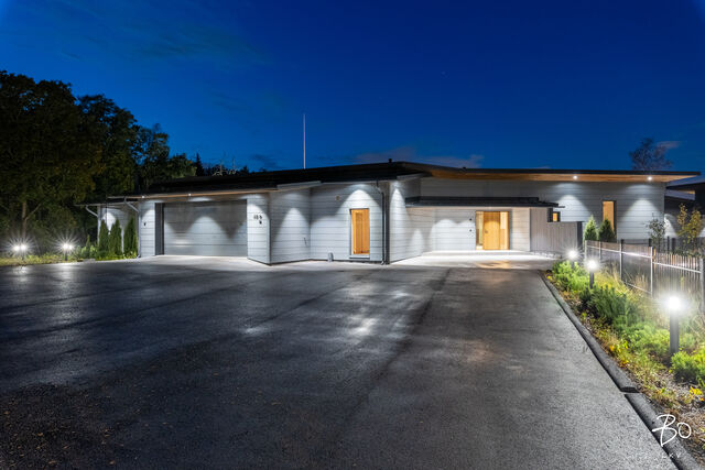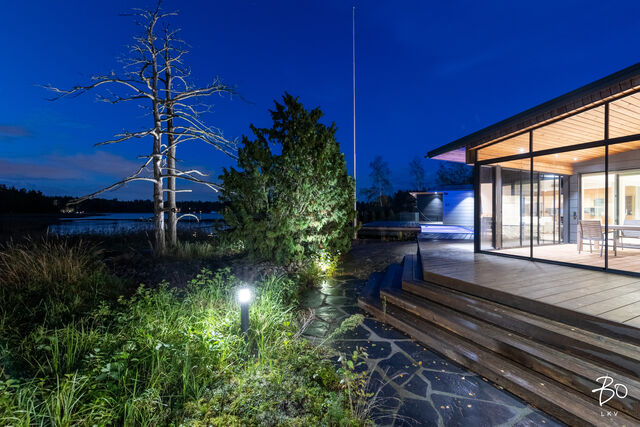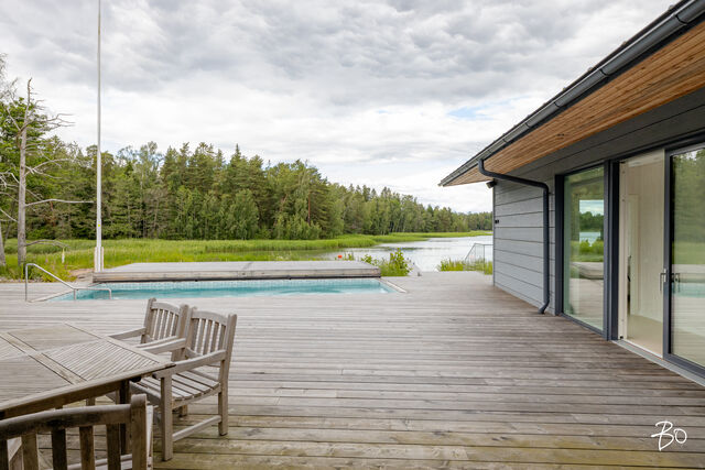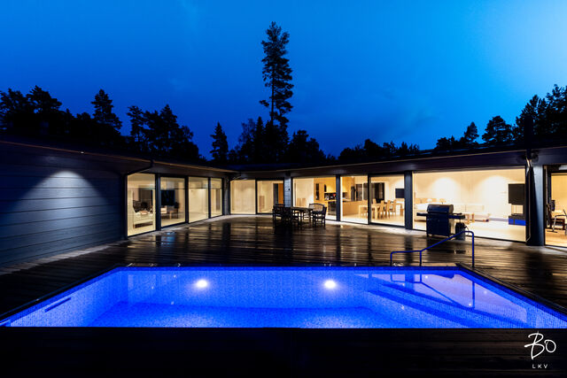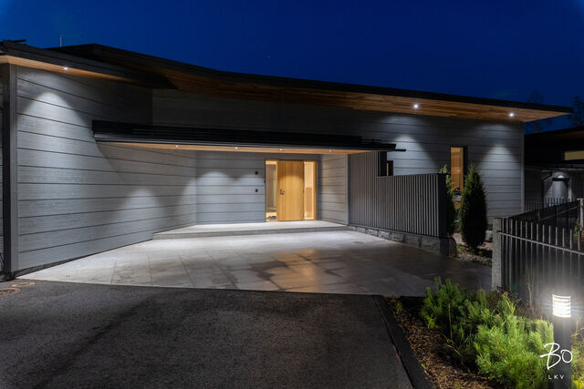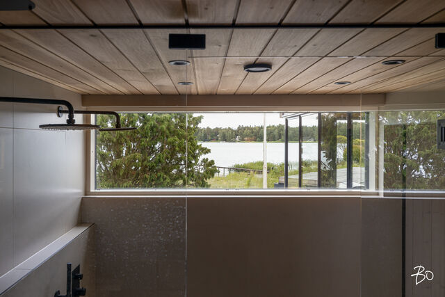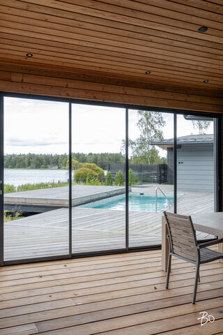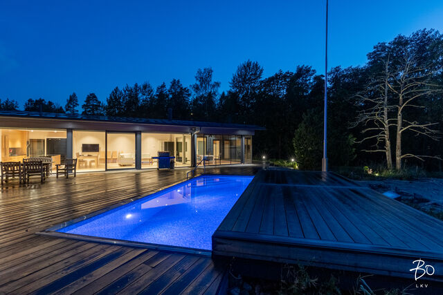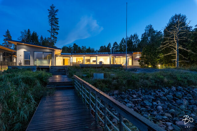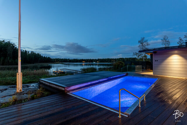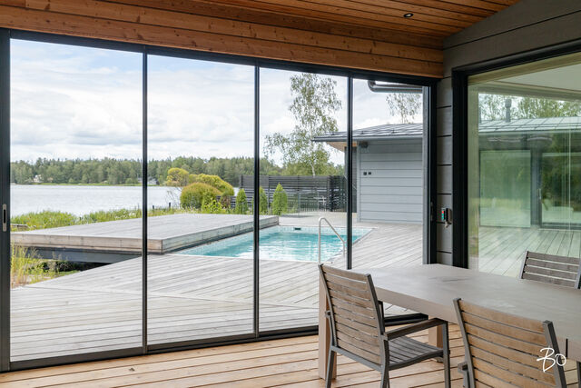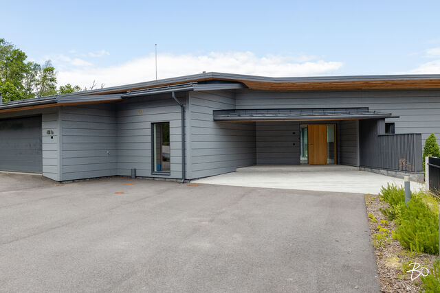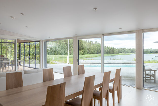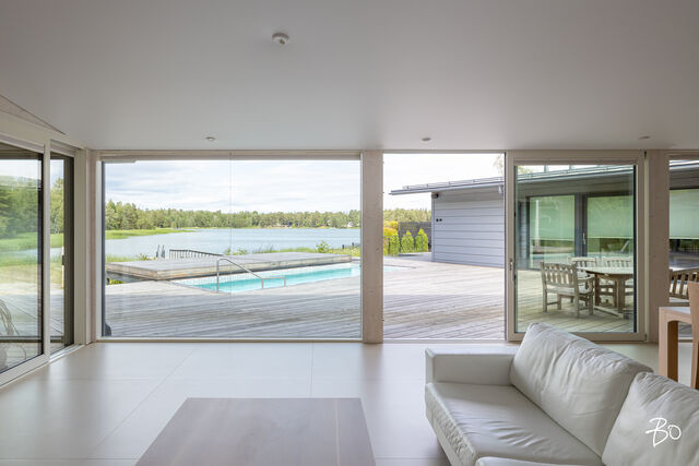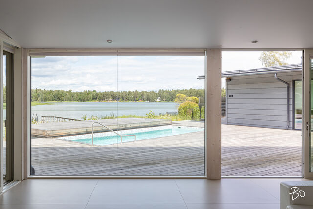 Etusivu / Uusimaa / Espoo / Suvisaarentie 48 B 1 / 1 Suvisaarentie 48 B Suvisaaristo, Espoo | Omakotitalo | Oh, avokeittiö, 3 mh, 2 arkioh, khh, 2 kph/wc, 2 erill. wc, s, ph / 285,5 m2 2 995 000 € Velaton hinta 234,0 m2 Asuinpinta-ala 285,5 m2 Kokonaispinta-ala 2023 Rakennusvuosi Omarantainen, yksikerroksinen omakotitalo Suvisaaristossa. Ainutlaatuinen tilaisuus hankkia itselle omarantainen koti Espoon Suvisaaristosta. Tämä arkkitehtonisesti mielenkiintoinen moderni CLT- talo on rakennettu yhteen tasoon. Talon meren puolella on jättimäinen terassialue, joka aukeaa viuhkana suoraan merelle, tarjoten asukkailleen maksimaalisen yksityisyyden ja uskomattomat maisemat. Terassiin on upotettu eristetyn moottorikäyttöisen kannen alle ympärivuotisesti käytössä oleva maalämmöllä lämmitetty uima-allas vastavirtalaitteineen. Rantaan vievän polun päässä on vankka massiiviponttonilaituri, josta voi pulahtaa uimaan mereen tai nauttia merellisistä harrastuksista. Laituriin mahtuu reilun kokoinen vene ja suojaiselta lahdelta pääsee navigoimaan helposti avomerelle. Heti sisääntuloaulasta aukeaa upea näköala edessä olevan suuren terassin yli merelle. Koko rakennus on muutenkin rakennettu edessä olevan maiseman ehdoilla. Talon päätilojen merenpuoleinen seinälinja on yhdistelmä lattiasta kattoon ulottuvaa lasiseinää ja suuria lasiliukuovia, joiden avulla ulko- ja sisätilat yhdistyvät yhdeksi tilaksi. Olohuone on avara ja kaunis. Siellä on oma tilansa niin sohvaryhmälle kuin isolle ruokapöydällekin. Olohuoneesta on käynti liukuoven kautta edessä olevalle terassille rentoutumaan tai vaikkapa ruokailemaan ulkoilmassa. Olohuoneen jatkona on myös suuri lasitettu ja katettu terassi, joka tarjoaa viihtyisän sääsuojan istuskeluryhmälle tai ulkoruokailulle.Olohuoneen yhteydessä on puhdaslinjainen avokeittiö, jonka erottaa ruokailutilasta suuri saareke. Tammiset puusepän tekemät mittatilauskalusteet ja mustat graniittitasot ovat klassinen materiaaliyhdistelmä, joka toimii hienosti modernin arkkitehtuurin kanssa. Keittiö on kattavasti koneellistettu Mielen ja Festivon laadukkain konein. Kalusteisiin integroitu kahvikone, viinikaappi, aamiaiskaappi ja tasoon upotettu induktioliesi integroidulla liesituulettimella, sekä erilaiset uunivaihtoehdot tekevät ruuanlaitosta miellyttävää. Keittiön jatkona on liukuovella erotettuna samanlaisin tammikalustein varustettu apukeittiö/kodinhoitotila. Tämä tila toimii samalla myös sivueteisenä saavuttaessa autotallista sisäkautta asuntoon. Olohuoneen jatkona on arkiolohuone ja hieno saunaosasto tarpeellisine pukeutumis- ja saniteettitiloineen. Sauna on varustettu sekä puu- että sähkökiukaalla ja lauteilta on hienot näkymät merelle. Saunaosastolta pääsee suoraan ulos terassille ja uima-altaalle tai pulahtamaan mereen.Makuuhuoneet sijaitsevat omassa rauhassaan talon toisessa päässä. Päämakuuhuone avautuu upeasti suoraan merelle ja sieltä pääsee altaalle ja rantaan liukuoven kautta. Päämakuuhuoneen yhteydessä on tilava vaatehuone, sekä privaatit kylpyhuone- ja wc-tilat. Päämakuuhuoneen vieressä on arkiolohuone, joka muuntuu uuden omistajan tarpeiden mukaan esim. työ- tai makuuhuonetilaksi. Kaksi muuta makuuhuonetta ovat myös tilavia ja niissä on hyvät kaappitilat vaatesäilytykseen. Näiden makuuhuoneiden yhteydessä on yhteinen kylpyhuone ja erillinen wc-tila.Tyylikäs ja iso piha-alue on kauttaaltaan aidattu ja on siksi turvallinen ja yksityinen. Piha on suunniteltu helppohoitoiseksi. Terassien ja päällystettyjen alueiden ulkopuolelle jäävät tilat ovat helppohoitoista kunttaa ja niittyä. Autoilijan tarpeet on huomioitu hyvin. Avaralle pihalle saavutaan sähkötoimisen portin kautta. Etupihalla on runsaasti tilaa autojen pysäköinnille ja talossa on lisäksi kahden auton tilava talli. Suvisaaristo on yksi Espoon vanhimmista ja arvostetuimmista asuinalueista, joka on tunnettu merellisestä ympäristöstään, rauhallisuudestaan ja väljästä asumisesta isoilla tonteilla. Tässä kohteessa voit yhdistää kodin ja vapaa-ajan asumisen kätevästi. Vaikka Suvisaaristo sijaitsee omassa rauhassaan, ei se ole kuitenkaan menettänyt yhteyttään kaupunkielämään. Vierestä kulkee bussiyhteys metrolle ja omalla autolla liikut nopeasti länsiväylälle, Helsingin keskustaan tai kehäteiden kautta ulosmenoteille. Tervetuloa tutustumaan tähän arvokohteeseen,Pekka Kujala, 040 832 8888, pekka@bo.fitaiRaya Virtanen, 040 820 7717, raya@bo.fi Kiinnostaako tämä kohde?Ota meihin yhteyttä tai jätä viesti Pekka Kujala kiinteistönvälittäjä LKV, partner 040 832 8888 pekka@bo.fi Tutustu välittäjään Varaa aika kalenteristani RakennusRakennusvuosi (aloitettu)2021Käyttöönottovuosi2023RakennusmateriaaliPuuRakennusmateriaalien kuvausUlkoseinät 200 mm ristiin liimattu massiivipuu (CLT, Cross Laminated Timber), ilmarako + Versowood kuningaspaneeli 42 x 312mm. Väliseinät 90 mm CLT. Sisäseinät luonnollinen massiivipuupinta, näkyvät pinnat kuusta. Ikkunat KLAS1 puualumiini ikkunat. PROFIN lasiliukuovet, ulkopuoli alumiinia.KattotyyppiPulpettiKatePaikalla tehty konesaumapeltikattoKaton kuntoHyväAsuinpinta-ala234,0 m2 (285,5 m2)Lisätietoja pinta-alastaPinta-ala 234 m2 on saatu db -arkkitehdit Oy:n 8.2.2021 laatimista ja Espoon kaupungin 28.6.2021 leimaamista arkkitehtipiirustuksista. Espoon kaupungin 20.2.2025 päivätyn Rakennus- ja huoneistorekisterin mukaan huoneistoala on 233 m2. Muut tilat: Autotalli 51,5 m2 (55 k-m2). Rakennuksen yhteydessä on lasitettu terassi 24,7 m2, ja erillinen kellari/varastotila 17,5 m2 (23 k-m2), joita ei ole laskettu mukaan pinta-alaan. Kerrokset1Muut tilat51,5 m2Lämmitysjärjestelmän kuvausMaalämpö, muuLämmön jakotapaVesikiertoinen lattialämmitysHuonelukuOh, avokeittiö, 3 mh, 2 arkioh, khh, 2 kph/wc, 2 erill. wc, s, ph / 285,5 m2Keittiön kuvaus, lisätiedot ja varustusPoikkeuksellisen tyylikäs puusepällä mittatilauksena teetetty tammikeittiö, jossa