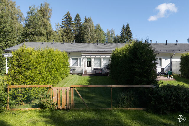 Etusivu / Keski-Suomi / Laukaa / Patruunantie 5 1 / 1 Patruunantie 5 Vihtavuori, Laukaa | Rivitalo | 2h+kt+khh+s 129 900 € Velaton hinta 58,5 m2 Asuinpinta-ala 163,80 €/kk Hoitovastike 2015 Rakennusvuosi Bo! Tervetuloa tutustumaan tilavaan ja kauniisti laitettuun rivitalokotiin! Tämä tilava kaksio ihastuttaa heti sisään tullessa lämpimillä sisustussävyillään ja kodikkaalla tyylillään, jotka luovat lämpöisen tunnelman. Asunnon läpitalon huoneistoratkaisu varmistaa, että luonnonvalo tulvii sisään molemmista suunnista, tuoden valoa ja tilan tuntua kotiin. Erillinen kodinhoitohuone sekä tilava keittiö- ja olohuoneyhdistelmä tekevät tästä kodista toimivan kokonaisuuden ja ihanan paikan viihtyä.Taloyhtiö sijaitsee omalla tontilla, ja kiinteistöä on hoidettu erinomaisesti. Asunnon terassi ja oma piha tarjoavat miellyttävät puitteet ulkoilmasta nautiskeluun. Piha on viihtyisä oleskelualue ja siellä voi temmeltää lemmikitkin. Se on sopiva paikka rentoutumiseen tai vaikkapa illanviettoihin ystävien kanssa. Maalämpö takaa asumisen ekologisuuden ja pienet kustannukset, mikä tekee asumisesta entistäkin miellyttävämpää.Patruunantie 5 sijaitsee ihanteellisella paikalla Vihtavuoressa, missä kaikki tarvittavat palvelut ovat käden ulottuvilla. Lähistöltä löydät muun muassa päivittäispalvelut, koulut ja erinomaiset harrastusmahdollisuudet, jotka tekevät arjesta sujuvaa ja mukavaa. Vieressä on urheilukenttä sekä Vihtavuoren frisbeegolfrata. Lisäksi alueen rauhallinen ja vehreä ympäristö tarjoaa paitsi turvallisuutta, myös mahdollisuuden nauttia luonnonläheisestä asumisesta. Kulkuyhteydet Jyväskylään ja Laukaaseen ovat helpot ja nopeat.Tätä kohdetta ei kannata ohittaa! Tämä kaunis koti voi toteuttaa unelmasi mukavasta ja käytännöllisestä kodista ilman suuria tulevia remonttihuolia. Autopaikankin voit ostaa itsellesi. Varaa aika esittelyyn ja tule ihastumaan!Anna Humalajokiasuntomyyjä, partner040 831 1087anna.humalajoki@bo.fi Kiinnostaako tämä kohde?Ota meihin yhteyttä tai jätä viesti Anna Humalajoki asuntomyyjä, partner 040 831 1087 anna.humalajoki@bo.fi Tutustu välittäjään Varaa aika kalenteristani HuoneistoOsakkeet4141-4725HallintamuotoAsunto-osakeyhtiöHuoneluku2h+kt+khh+sKerros/Kerroksia1/1Asuinpinta-ala58,5 m2Muut tilat0,0 m2Lisätietoja pinta-alasta Isännöitsijäntodistuksen mukainen.Keittiön kuvaus, lisätiedot ja varustusB:hard kovapuulattiaLiesiIntegroitu liesiKeittiön työtasojen materiaaliLaminaattiKeittiön seinien materiaaliMaalattu, osalaatoitusPesutilojen kuvaus, lisätiedot ja varustusKatto paneelia Kylpyhuoneen varustusLattialämmitys, suihkuKylpyhuoneen lattiamateriaaliLaattaKylpyhuoneen seinämateriaaliKaakeliWC-tilojen kuvausAllaskaappi ja peilivalaisinVarustus: lattialämmitys, bidee-suihkuLukumäärä: 1Lattiamateriaalit: laattaSeinämateriaalit: kaakeli, maalattuKodinhoitohuoneVälitilassa kaakeliVarustus: pesukoneliitäntä, pesuallas, lattialämmitys, lattiakaivo, pyykkikaapit, pöytätasoLattiamateriaalit: laattaSeinämateriaalit: kaakeli, maalattuSaunan kuvaus, lisätiedot ja varustusSeinät ja katto paneeliaSaunan lattiamateriaaliLaattaSaunan seinämateriaaliPuuMakuuhuoneen kuvaus, lisätiedot ja varustusB:hard kovapuulattiaLukumäärä: 1Seinämateriaalit: maalattuOleskelutilojen kuvaus, lisätiedot ja varustusB:hard kovapuulattiaSeinämateriaalit: maalattuLattiamateriaalitB:hard kovapuulattiaKattomateriaalitMdf paneelikattoMuuta kauppaan kuuluvaaIlmalämpöpumppuMuutostyöt huoneistossaMakuuhuoneen seinä 2021 Eteisen seinät 2021 Olohuoneen seinä 2023 Keittiön seinä 2024 Asunnon lattiat ja jalkalistat 1/2025 Keittiön, pesuhuoneen ja saunan valaistus 1/2025 Ilmalämpöpumppu 2023 Takapihan maatyöt kesällä 2022 KuntoHyväLisätietoa kunnostaSiisti ja hyväkuntoinen Kiinteistö- ja yhtiötiedotYhtiön nimiAsunto Oy Laukaan Patruunantie 5Tontin omistusOmaTontin koko3 426,00 m2Käyttöönottovuosi2015RakennusmateriaaliPuuKattotyyppiHarjakattoKateTiiliLämmitysjärjestelmäMaalämpöLisätietoja energiatodistuksestaEnergiatodistus uusitaan 2025 kevään aikanaTehdyt korjaukset ja remontit2017 Yhtiön takapihan viheristutukset 2017 4 autopaikkaa lisätty, ei lämmitystolppia 2020 Lisäaitojen asennukset 2022 Roskakatoksen katteen uusiminen 2023 Taloyhtiön osakerekisteri sähköiseen muotoonTiedossa olevat tulevat korjaukset/remontitIlmanvaihtokanavien puhdistus ja säätö 2025 Maalämpöpumpun vuosihuollot 2024 -Autotallit4Pihapaikkoja5Lainat0,00 €Kiinnitykset750 000,00 €KiinteistönhoitoAsukkaatYhtiön tilat ja varusteluUrheiluvälinevarasto, huoneistokohtaiset varastot. Muita tietojaVapautuuSopimuksen mukaan AsumiskustannuksetHoitovastike163,80 €/kk (2,80 €/m2)Yhtiövastike yhteensä163,80 €Vesi15,00 €/hlö/kkAutopaikka20,44 €/kk HintaMyyntihinta129 900,00 € (2 220,51 €/m2)Velaton hinta129 900,00 € (2 220,51 €/m2)MaksutapaKäteinen. Sinua voisi kiinnostaa Asunnon hinta-arvio ja arviokäynti Asunnon hinta-arvio ja arviokäynti Mitä hinta-arvio maksaa tai miten arviokäyntiä varten kannattaa valmistautua? Katso vastauksemme usein kysyttyihin ky… Sneak Peek® Sneak Peek® Sneak Peek® -palvelumme on askeleen edellä! Löydä alueesi uusimmat ja upeimmat asunnot jo ennen kuin ne ilmestyvät as… Asuntovahti Asuntovahti Etsimässä uutta asuntoa? Aseta itsellesi Bo-asuntovahti. Saat tiedon heti, kun unelmiesi asunto tulee myyntiin. Bo Match Bo Match Kun asuntounelmat ja unelmien asunnot kohtaavat, syntyy Bo Match. Tutustu uudenlaiseen tapaan käydä asuntokauppaa.