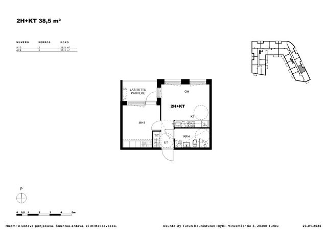 Etusivu / Varsinais-Suomi / Turku / Konsantie 1 1 / 1 Konsantie 1 Raunistula, Turku | Kerrostalo | 2h, avok, kph, et, lasit.p 185 900 € Velaton hinta 38,5 m2 Asuinpinta-ala 150,15 €/kk Hoitovastike 2027 Rakennusvuosi HYÖDYNNÄ HUIPPUETU! Varaa asunto helposti ilman varausmaksua. Kauppakirjojen allekirjoituksen yhteydessä maksat myyntihinnasta vain 15 % ja loput vasta kodin valmistuessa (arvioitu valmistumisaika vuoden 2027 aikana).Raunistulan Idylli Modernia asumista Turun sydämessäRaunistulan Idylli yhdistää viehättävän puutaloalueen rauhan modernin asumisen mukavuuksiin. Asunnoissa on suuret ikkunat ja toimivat pohjaratkaisut. Tämä nelikerroksinen kerrostalo kohoaa Raunistulan sydämeen, vain lyhyen matkan päähän Turun keskustasta. Arvioitu valmistuminen vuoden 2027 aikana. Tämä toimiva ja viihtyisä toisen kerroksen kaksio tarjoaa sujuvaa arkea ja asumista. Moderni ja selkeäpohjainen tila on helppo sisustaa juuri omien mieltymystesi mukaan. Olohuone yhdistyy luontevasti I-keittiöön luoden viihtyisän ja valoisan tilan yhdessäoloon tai rentoutumiseen pitkän päivän jälkeen. Toimiva pohjaratkaisu, runsaat säilytystilat ja suuret ikkunat tekevät kodista valoisan ja käytännöllisen. Makuhuoneesta avautuva lasitettu parveke toimii ympäri vuoden viihtyisänä oleskelupaikkana, jonne saat vaikkapa petivaatteet kätevästi tuulettumaan. Asunnossa on varaus viilentävälle ilmalämpöpumpulle.Idyllin asunnot sopivat niin yksinasuville, pariskunnille kuin pienille perheillekin. Tarjolla on myös muun muassa loft-tyylisiä koteja, joissa huonekorkeus kohoaa jopa neljään metriin ja nukkumaparvella on yli puolitoista metriä korkeutta. Ensimmäisen kerroksen asunnoissa on oma sisäänkäynti omalta pikkupihalta. Idyllissä arki sujuu ilman remonttihuolia tai pihatöitä. Taloyhtiöllä on vehreä ja viihtyisä piha, oma pihasauna, yhteinen kuntoilutila, pyörävarasto pesupaikkoineen sekä sähköautojen latausmahdollisuus. Asunnoissa on varaus ilmalämpöpumpulle ja taloyhtiössä varaudutaan aurinkopaneeleihin. Energiatehokkuus ja vastuulliset asumisratkaisut varmistavat kestävän ja miellyttävän asumisen.Raunistula on viehättävä puutalopainotteinen asuinalue vain 2 km päässä Turun keskustasta, rautatieasemalta ja Turun yliopistosta. Logomo sekä suunnitteilla oleva uusi Turun Ratapihan elämyskeskus ja areena tulevat sijaitsemaan vain kävelymatkan etäisyydellä.Kohde ennakkomarkkinoinnissa, kerromme mielellämme lisätietoja! Kohteen rakennuttamisesta vastaa SRV, joka on luotettava ja vakavarainen toimija. Myynti ja esittelyt/Miika Salmelap. 0500 533 582miika.salmela@bo.fijaSaija Palinp. 040 756 7070saija.palin@bo.fijaTAINA VUORIp. 050 527 4106taina.vuori@bo.fi Kiinnostaako tämä kohde?Ota meihin yhteyttä tai jätä viesti Miika Salmela asuntomyyjä, partner 0500 533 582 miika.salmela@bo.fi Tutustu välittäjään HuoneistoOsakkeet9266-9650HallintamuotoAsunto-osakeyhtiöHuoneluku2h, avok, kph, et, lasit.pKerros/Kerroksia2/4Asuinpinta-ala38,5 m2Muut tilat0,0 m2Lisätietoja pinta-alastaPinta-ala ei ole tarkistusmitattuNäkymätHuoneistoilla on parvekkeet pohjapiirustusten mukaisesti. Lattia, katto ja seinät ovat betonirakenteisia. Parvekekaiteet ovat pääosin lasikaiteita. Asuntoparvekkeet ovat pääosin lasitettuja. Parvekkeet ovat ulkotiloja. Osassa parvekepielistä on asennettu varatieluukku, joka toimii poistumisreittinä hätätilanteessa. Osassa 1. kerroksen asunnoista on maantasoterassit. Maantasoterasseja ei lasiteta. Maantasoterasseilla on terassilaudoitus. ParvekeLasitettuHissiTaloyhtiössä on hissiKeittiön kuvaus, lisätiedot ja varustusKeittiökalusteiden ovet ja etusarjat ovat tehtaan vakiomallistoa. Kodinkoneet (Electrolux). KEITTOTASO: Induktiotaso 60 cm. KEITTOTASO: Induktiotaso 60 cm. KALUSTEUUNI: Teräs tai valkoinen 60 cm. MIKROAALTOUUNI: Valkoinen tai musta 60 cm. ASTIANPESUKONE: Astianpesukone 60 cm, kalustepeitteinen, ovi keittiön mukaan. JÄÄKAAPPI: Jääkaappi, vapaasti seisova, valkoinen/teräs. Kaappipakastin, vapaasti seisova, valkoinen/teräs. Jääkaappipakastin, vapaasti seisova, valkoinen/teräs. LIESIKUPU: Vallox Delico, valkoinen tai musta. KEITTIÖHANA: Oras Safira 1039F. PESUALLAS: Teräs tai musta, 40 tai 50 cm KEITTIÖN VÄLITILAVALAISIN: Kalustetoimittajan integroima LED-nauhavalaisin, 4000 K. Rakennuttajan puolelta on valmiiksi koottuna kolme eri tyylistä sisustusteemaa: Talvi, Kesä ja Syksy. Teemoja voi yhdistellä vapaasti keskenään. TALVI: KALUSTEOVI: Mattavalkoinen melamiiniovi. VEDIN: Yläovi, vetimetön. Alaovi ja korkeat komerot, RST lippavedin. KALUSTESOKKELI: Valkoinen, ei jalkalistaa keittiökalusteen eteen. TYÖTASO: Musta tai harmaa laminaattitaso. VÄLITILA: Valkoinen välitilalevy. KESÄ: KALUSTEOVI: Tammen sävyinen puukuvioinen melamiiniovi. VEDIN: Yläovi, vetimetön. Alaovi ja korkeat komerot, RST vedin. KALUSTESOKKELI: Valkoinen, ei jalkalistaa keittiökalusteen eteen. TYÖTASO: Marmorikuvioinen laminaattitaso. VÄLITILA: Valkoinen välitilalevy. SYKSY: KALUSTEOVI: Musta melamiiniovi, puusyykuvio. VEDIN: Yläovi, vetimetön. Alaovi ja korkeat komerot, messinkivedin. KALUSTESOKKELI: Valkoinen, ei jalkalistaa keittiökalusteen eteen. TYÖTASO: Marmorikuvioinen laminaattitaso.Pesutilojen kuvaus, lisätiedot ja varustusPesuhuoneessa on pyykinpesukoneliitäntä, varaus pesutornille, allas, allaskaluste ja sen yläpuolella valaisinpeilikaappi. Kalusteet ovat kalustelevyä. Suihkuseinä on pohjapiirrokseen merkityssä kohdassa. Suihkuseinien mitoitus on huoneistokohtaisten märkätilakaavioiden mukaan. Laatat: Laattapiste. PEILIKAAPPI: Svedbergs valkoinen peilikaappi LED-valolla 60 cm tai 80 cm. ALLAS JA ALLASKALUSTE: Svedbergs valkoinen posliiniallas ja valkoinen allaskaappi kahdella laatikolla 60 cm tai 80 cm. PESUALLASHANA: Oras Safira ECO 1012F-105, kromi, bidetta käsisuihkulla. SUIHKUHANA: Oras. Termostaattirunko 7462G kiinteällä juoksuputkella + Apollo- suihkusetti 548, kromi. WC-I