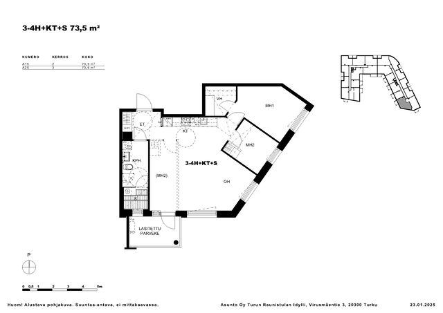 Etusivu / Varsinais-Suomi / Turku / Konsantie 1 1 / 1 Konsantie 1 Raunistula, Turku | Kerrostalo | 3-4h, avok, kph, s, et, lasit.p 291 900 € Velaton hinta 73,5 m2 Asuinpinta-ala 286,65 €/kk Hoitovastike 2027 Rakennusvuosi HYÖDYNNÄ HUIPPUETU! Varaa asunto helposti ilman varausmaksua. Kauppakirjojen allekirjoituksen yhteydessä maksat myyntihinnasta vain 15 % ja loput vasta kodin valmistuessa (arvioitu valmistumisaika vuoden 2027 aikana).Raunistulan Idylli Modernia asumista Turun sydämessäRaunistulan Idylli yhdistää viehättävän puutaloalueen rauhan modernin asumisen mukavuuksiin. Asunnoissa on suuret ikkunat ja toimivat pohjaratkaisut. Tämä nelikerroksinen kerrostalo kohoaa Raunistulan sydämeen, vain lyhyen matkan päähän Turun keskustasta. Arvioitu valmistuminen vuoden 2027 aikana. Tämä näyttävä huoneisto tarjoaa loistavan mahdollisuuden loihtia kodistasi juuri sinun tarpeisiisi sopivan. Huonelukumäärää on mahdollista muokata elämäntilanteen muuttuessa ja voit lisätä kotiisi helposti yhden huoneen rakentamisen aikana tai sen jälkeen. Toimivassa pohjaratkaisussa olohuone yhdistyy luontevasti keittiöön luoden viihtyisän ja valoisan tilan yhdessäoloon tai rentoutumiseen pitkän päivän jälkeen. Erillinen eteistila lisää arjen sujuvuutta, ja järjestystä arkeen tuo makuuhuoneen yhteydessä sijaitseva oma vaatehuone. Kaartuvat ja persoonalliset muodot tekevät jokaisesta tilasta mielenkiintoisen. Sisäpihalle avautuva lasitettu parveke toimii ympäri vuoden viihtyisänä oleskelupaikkana. Omassa saunassa voit rentoutua ja ladata akkuja pitkän päivän jälkeen. Asunnossa on varaus viilentävälle ilmalämpöpumpulle.Idyllin asunnot sopivat niin yksinasuville, pariskunnille kuin pienille perheillekin. Tarjolla on myös muun muassa loft-tyylisiä koteja, joissa huonekorkeus kohoaa jopa neljään metriin ja nukkumaparvella on yli puolitoista metriä korkeutta. Ensimmäisen kerroksen asunnoissa on oma sisäänkäynti omalta pikkupihalta. Idyllissä arki sujuu ilman remonttihuolia tai pihatöitä. Taloyhtiöllä on vehreä ja viihtyisä piha, oma pihasauna, yhteinen kuntoilutila, pyörävarasto pesupaikkoineen sekä sähköautojen latausmahdollisuus. Asunnoissa on varaus ilmalämpöpumpulle ja taloyhtiössä varaudutaan aurinkopaneeleihin. Energiatehokkuus ja vastuulliset asumisratkaisut varmistavat kestävän ja miellyttävän asumisen.Raunistula on viehättävä puutalopainotteinen asuinalue vain 2 km päässä Turun keskustasta, rautatieasemalta ja Turun yliopistosta. Logomo sekä suunnitteilla oleva uusi Turun Ratapihan elämyskeskus ja areena tulevat sijaitsemaan vain kävelymatkan etäisyydellä.Kohde ennakkomarkkinoinnissa, kerromme mielellämme lisätietoja! Kohteen rakennuttamisesta vastaa SRV, joka on luotettava ja vakavarainen toimija. Myynti ja esittelyt/Miika Salmelap. 0500 533 582miika.salmela@bo.fijaSaija Palinp. 040 756 7070saija.palin@bo.fijaTAINA VUORIp. 050 527 4106taina.vuori@bo.fi Kiinnostaako tämä kohde?Ota meihin yhteyttä tai jätä viesti Miika Salmela asuntomyyjä, partner 0500 533 582 miika.salmela@bo.fi Tutustu välittäjään HuoneistoOsakkeet10306-11040HallintamuotoAsunto-osakeyhtiöHuoneluku3-4h, avok, kph, s, et, lasit.pKerros/Kerroksia2/4Asuinpinta-ala73,5 m2Muut tilat0,0 m2Lisätietoja pinta-alastaPinta-ala ei ole tarkistusmitattuNäkymätHuoneistoilla on parvekkeet pohjapiirustusten mukaisesti. Lattia, katto ja seinät ovat betonirakenteisia. Parvekekaiteet ovat pääosin lasikaiteita. Asuntoparvekkeet ovat pääosin lasitettuja. Parvekkeet ovat ulkotiloja. Osassa parvekepielistä on asennettu varatieluukku, joka toimii poistumisreittinä hätätilanteessa. Osassa 1. kerroksen asunnoista on maantasoterassit. Maantasoterasseja ei lasiteta. Maantasoterasseilla on terassilaudoitus. ParvekeLasitettuHissiTaloyhtiössä on hissiKeittiön kuvaus, lisätiedot ja varustusKeittiökalusteiden ovet ja etusarjat ovat tehtaan vakiomallistoa. Kodinkoneet (Electrolux). KEITTOTASO: Induktiotaso 60 cm. KEITTOTASO: Induktiotaso 60 cm. KALUSTEUUNI: Teräs tai valkoinen 60 cm. MIKROAALTOUUNI: Valkoinen tai musta 60 cm. ASTIANPESUKONE: Astianpesukone 60 cm, kalustepeitteinen, ovi keittiön mukaan. JÄÄKAAPPI: Jääkaappi, vapaasti seisova, valkoinen/teräs. Kaappipakastin, vapaasti seisova, valkoinen/teräs. Jääkaappipakastin, vapaasti seisova, valkoinen/teräs. LIESIKUPU: Vallox Delico, valkoinen tai musta. KEITTIÖHANA: Oras Safira 1039F. PESUALLAS: Teräs tai musta, 40 tai 50 cm KEITTIÖN VÄLITILAVALAISIN: Kalustetoimittajan integroima LED-nauhavalaisin, 4000 K. Rakennuttajan puolelta on valmiiksi koottuna kolme eri tyylistä sisustusteemaa: Talvi, Kesä ja Syksy. Teemoja voi yhdistellä vapaasti keskenään. TALVI: KALUSTEOVI: Mattavalkoinen melamiiniovi. VEDIN: Yläovi, vetimetön. Alaovi ja korkeat komerot, RST lippavedin. KALUSTESOKKELI: Valkoinen, ei jalkalistaa keittiökalusteen eteen. TYÖTASO: Musta tai harmaa laminaattitaso. VÄLITILA: Valkoinen välitilalevy. KESÄ: KALUSTEOVI: Tammen sävyinen puukuvioinen melamiiniovi. VEDIN: Yläovi, vetimetön. Alaovi ja korkeat komerot, RST vedin. KALUSTESOKKELI: Valkoinen, ei jalkalistaa keittiökalusteen eteen. TYÖTASO: Marmorikuvioinen laminaattitaso. VÄLITILA: Valkoinen välitilalevy. SYKSY: KALUSTEOVI: Musta melamiiniovi, puusyykuvio. VEDIN: Yläovi, vetimetön. Alaovi ja korkeat komerot, messinkivedin. KALUSTESOKKELI: Valkoinen, ei jalkalistaa keittiökalusteen eteen. TYÖTASO: Marmorikuvioinen laminaattitaso.Pesutilojen kuvaus, lisätiedot ja varustusPesuhuoneessa on pyykinpesukoneliitäntä, varaus pesutornille, allas, allaskaluste ja sen yläpuolella valaisinpeilikaappi. Kalusteet ovat kalustelevyä. Suihkuseinä on pohjapiirrokseen merkityssä kohdassa. Suihkuseinien mitoitus on huoneistokohtaisten märkätilakaavioiden mukaan. Laatat: Laattapiste. PEILIKAAPPI: Svedbergs valkoinen peilikaappi LED-valolla 60 cm tai 80 cm. ALLAS JA ALLASKALUSTE: Svedbergs valkoinen posliinialla
