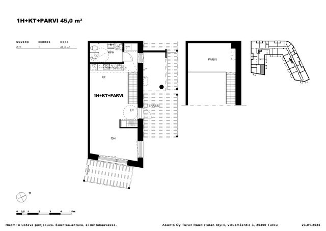 Etusivu / Varsinais-Suomi / Turku / Konsantie 1 1 / 1 Konsantie 1 Raunistula, Turku | Kerrostalo | 1h, avok, parvi, kph, et, terassi 225 850 € Velaton hinta 45,0 m2 Asuinpinta-ala 56,5 m2 Kokonaispinta-ala 2027 Rakennusvuosi HYÖDYNNÄ HUIPPUETU! Varaa asunto helposti ilman varausmaksua. Kauppakirjojen allekirjoituksen yhteydessä maksat myyntihinnasta vain 15 % ja loput vasta kodin valmistuessa (arvioitu valmistumisaika vuoden 2027 aikana).Raunistulan Idylli Modernia asumista Turun sydämessäRaunistulan Idylli yhdistää viehättävän puutaloalueen rauhan modernin asumisen mukavuuksiin. Asunnoissa on suuret ikkunat ja toimivat pohjaratkaisut. Tämä nelikerroksinen kerrostalo kohoaa Raunistulan sydämeen, vain lyhyen matkan päähän Turun keskustasta. Arvioitu valmistuminen vuoden 2027 aikana. Tämä upea loft-asunto hurmaa jo ensisilmäyksellä. Kulmahuoneiston yli neljään metriin kohoava huonekorkeus ja isot ikkunat luovat lisätilan tuntua ja korostavat asunnon avaruutta. Ainutlaatuinen parvi (11,5 m2) lisää asunnon toimivuutta ja tarjoaa mahdollisuuksia esimerkiksi makuutilaksi tai kodikkaaksi työskentelynurkkaukseksi. Asunnon omalle terassille avautuva sisäänkäynti tekee kotiin saapumisesta erityisen miellyttävää ja tuo ripauksen yksityisyyttä. Voit rakentaa terassista oman keitaan, jolle omaa rauhaa tuovat pergola ja köynnöskasvit. Toimivassa pohjaratkaisussa keittiö on fiksusti suunniteltu, ja olohuone rajautuu avaraksi ja tyylikkääksi oleskelutilaksi. Asunnossa on varaus viilentävälle ilmalämpöpumpulle. Idyllin asunnot sopivat niin yksinasuville, pariskunnille kuin pienille perheillekin. Tarjolla on myös muun muassa loft-tyylisiä koteja, joissa huonekorkeus kohoaa jopa neljään metriin ja nukkumaparvella on yli puolitoista metriä korkeutta. Ensimmäisen kerroksen asunnoissa on oma sisäänkäynti omalta pikkupihalta. Idyllissä arki sujuu ilman remonttihuolia tai pihatöitä. Taloyhtiöllä on vehreä ja viihtyisä piha, oma pihasauna, yhteinen kuntoilutila, pyörävarasto pesupaikkoineen sekä sähköautojen latausmahdollisuus. Asunnoissa on varaus ilmalämpöpumpulle ja taloyhtiössä varaudutaan aurinkopaneeleihin. Energiatehokkuus ja vastuulliset asumisratkaisut varmistavat kestävän ja miellyttävän asumisen.Raunistula on viehättävä puutalopainotteinen asuinalue vain 2 km päässä Turun keskustasta, rautatieasemalta ja Turun yliopistosta. Logomo sekä suunnitteilla oleva uusi Turun Ratapihan elämyskeskus ja areena tulevat sijaitsemaan vain kävelymatkan etäisyydellä.Kohde ennakkomarkkinoinnissa, kerromme mielellämme lisätietoja! Kohteen rakennuttamisesta vastaa SRV, joka on luotettava ja vakavarainen toimija. Myynti ja esittelyt/Miika Salmelap. 0500 533 582miika.salmela@bo.fijaSaija Palinp. 040 756 7070saija.palin@bo.fijaTAINA VUORIp. 050 527 4106taina.vuori@bo.fi Kiinnostaako tämä kohde?Ota meihin yhteyttä tai jätä viesti Miika Salmela asuntomyyjä, partner 0500 533 582 miika.salmela@bo.fi Tutustu välittäjään HuoneistoOsakkeet4791-5240HallintamuotoAsunto-osakeyhtiöHuoneluku1h, avok, parvi, kph, et, terassiKerros/Kerroksia1/4Asuinpinta-ala45,0 m2Muut tilat11,5 m2Lisätietoja pinta-alastaParvi 11,5 m2. Pinta-ala ei ole tarkistusmitattu.NäkymätHuoneistoilla on parvekkeet pohjapiirustusten mukaisesti. Lattia, katto ja seinät ovat betonirakenteisia. Parvekekaiteet ovat pääosin lasikaiteita. Asuntoparvekkeet ovat pääosin lasitettuja. Parvekkeet ovat ulkotiloja. Osassa parvekepielistä on asennettu varatieluukku, joka toimii poistumisreittinä hätätilanteessa. Osassa 1. kerroksen asunnoista on maantasoterassit. Maantasoterasseja ei lasiteta. Maantasoterasseilla on terassilaudoitus. HissiTaloyhtiössä on hissiKeittiön kuvaus, lisätiedot ja varustusKeittiökalusteiden ovet ja etusarjat ovat tehtaan vakiomallistoa. Kodinkoneet (Electrolux). KEITTOTASO: Induktiotaso 60 cm. KEITTOTASO: Induktiotaso 60 cm. KALUSTEUUNI: Teräs tai valkoinen 60 cm. MIKROAALTOUUNI: Valkoinen tai musta 60 cm. ASTIANPESUKONE: Astianpesukone 60 cm, kalustepeitteinen, ovi keittiön mukaan. JÄÄKAAPPI: Jääkaappi, vapaasti seisova, valkoinen/teräs. Kaappipakastin, vapaasti seisova, valkoinen/teräs. Jääkaappipakastin, vapaasti seisova, valkoinen/teräs. LIESIKUPU: Vallox Delico, valkoinen tai musta. KEITTIÖHANA: Oras Safira 1039F. PESUALLAS: Teräs tai musta, 40 tai 50 cm KEITTIÖN VÄLITILAVALAISIN: Kalustetoimittajan integroima LED-nauhavalaisin, 4000 K. Rakennuttajan puolelta on valmiiksi koottuna kolme eri tyylistä sisustusteemaa: Talvi, Kesä ja Syksy. Teemoja voi yhdistellä vapaasti keskenään. TALVI: KALUSTEOVI: Mattavalkoinen melamiiniovi. VEDIN: Yläovi, vetimetön. Alaovi ja korkeat komerot, RST lippavedin. KALUSTESOKKELI: Valkoinen, ei jalkalistaa keittiökalusteen eteen. TYÖTASO: Musta tai harmaa laminaattitaso. VÄLITILA: Valkoinen välitilalevy. KESÄ: KALUSTEOVI: Tammen sävyinen puukuvioinen melamiiniovi. VEDIN: Yläovi, vetimetön. Alaovi ja korkeat komerot, RST vedin. KALUSTESOKKELI: Valkoinen, ei jalkalistaa keittiökalusteen eteen. TYÖTASO: Marmorikuvioinen laminaattitaso. VÄLITILA: Valkoinen välitilalevy. SYKSY: KALUSTEOVI: Musta melamiiniovi, puusyykuvio. VEDIN: Yläovi, vetimetön. Alaovi ja korkeat komerot, messinkivedin. KALUSTESOKKELI: Valkoinen, ei jalkalistaa keittiökalusteen eteen. TYÖTASO: Marmorikuvioinen laminaattitaso.Pesutilojen kuvaus, lisätiedot ja varustusPesuhuoneessa on pyykinpesukoneliitäntä, varaus pesutornille, allas, allaskaluste ja sen yläpuolella valaisinpeilikaappi. Kalusteet ovat kalustelevyä. Suihkuseinä on pohjapiirrokseen merkityssä kohdassa. Suihkuseinien mitoitus on huoneistokohtaisten märkätilakaavioiden mukaan. Laatat: Laattapiste. PEILIKAAPPI: Svedbergs valkoinen peilikaappi LED-valolla 60 cm tai 80 cm. ALLAS JA ALLASKALUSTE: Svedbergs valkoinen posliiniallas ja valkoinen allaskaappi kahdella laatikolla 60 cm tai 80 cm. PESUALLASHANA: Oras Safira ECO 1012F-105, kromi, bi